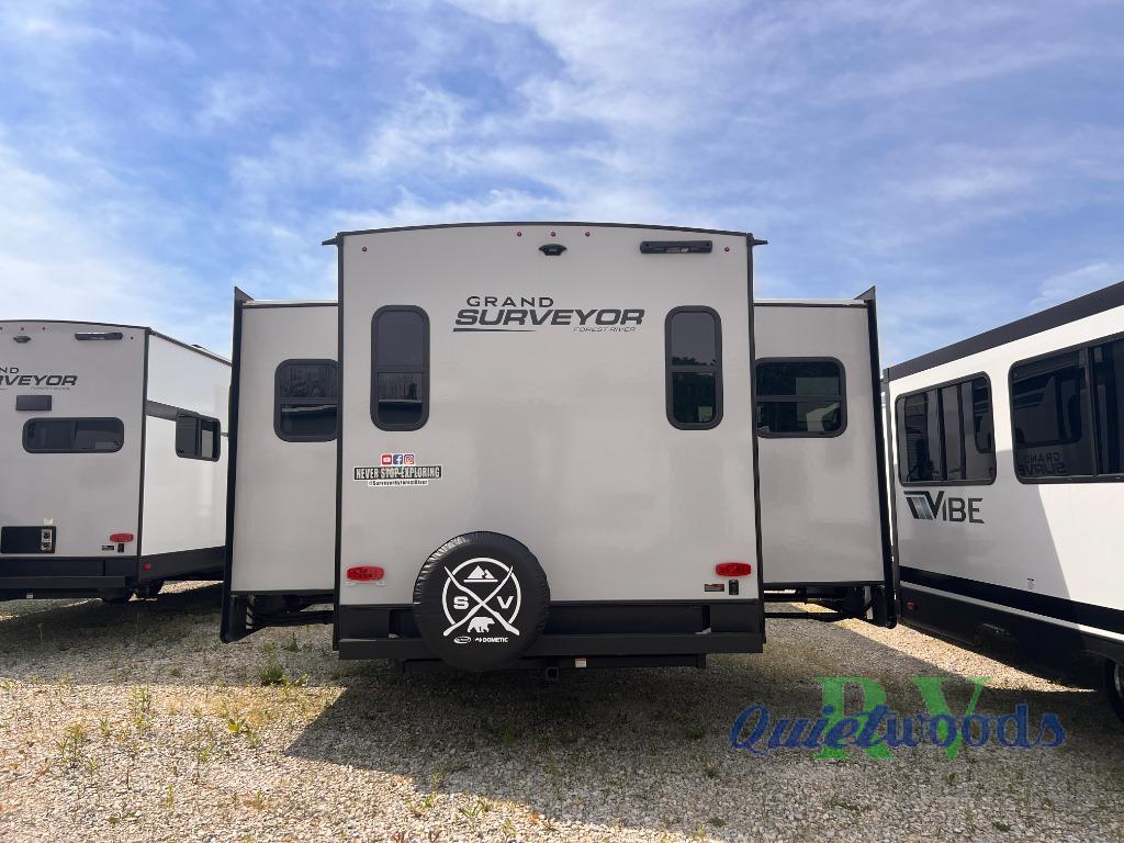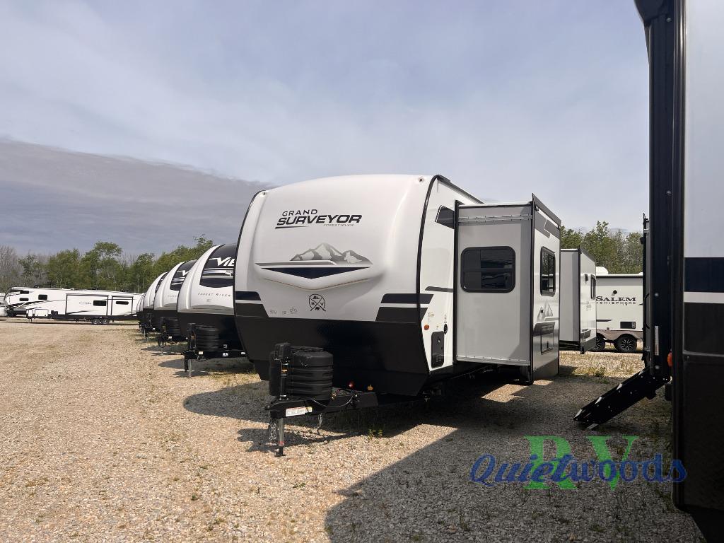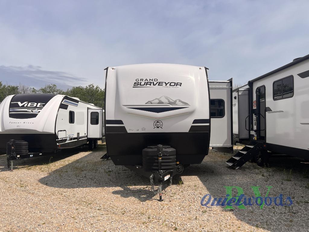With any Grand Surveyor travel trailer by Forest River you will enjoy turn-key ready-to-go features and quality construction! Each model includes Azdel composite walls and a gel coated fiberglass front cap with an automotive style tinted windshield for a sleek look. There are friction hinge black glass entry door(s), an adjustable platform step with a night light, plus Goodyear tires and a power tongue jack for easy towing. The interior will have you feeling right at home with roller shades, residential faucets, sinks, and bathroom vanity, plus Surf(x) seamless countertops throughout. You can also plan for adventure with a 2" rear accessory and exterior spray port, and there are slam latch baggage doors throughout to keep all your gear secure. Other stand-out features include a central vacuum system, a 200 watt solar panel with a 30 amp controller, a tankless water heater, carpet-free interiors, and the list goes on!