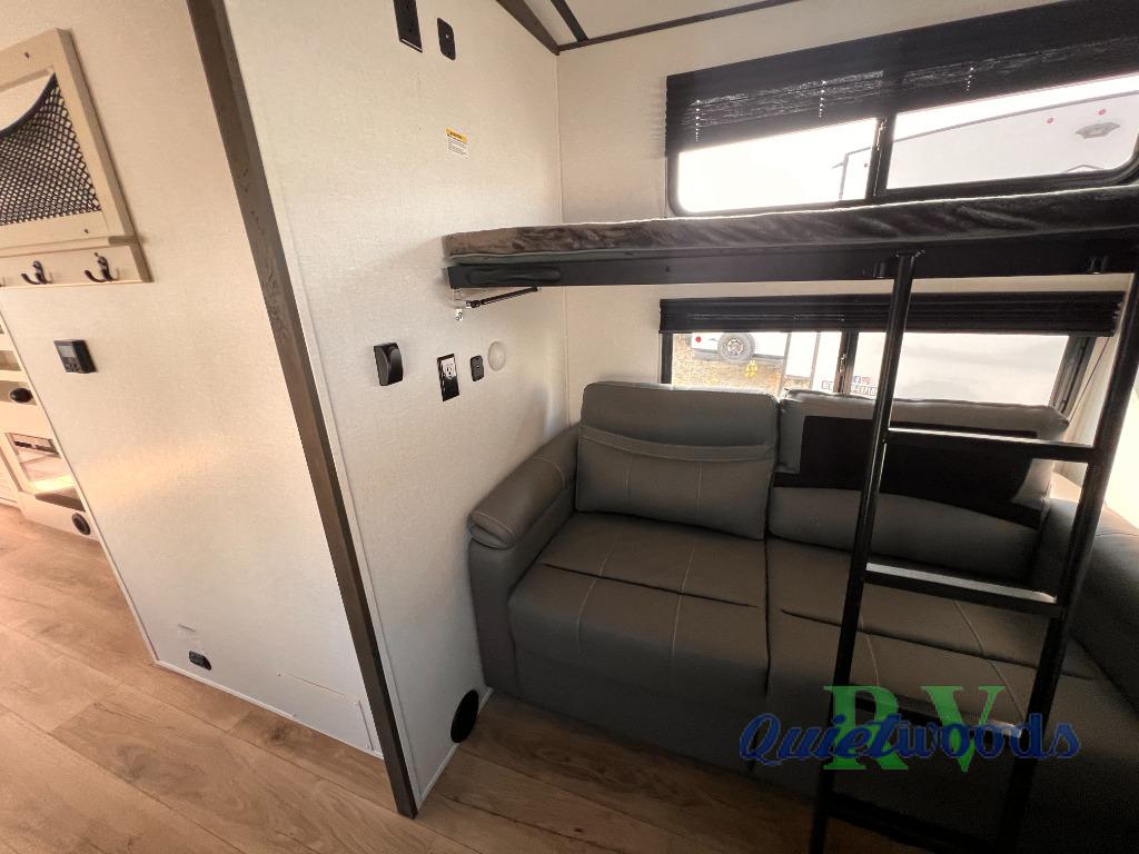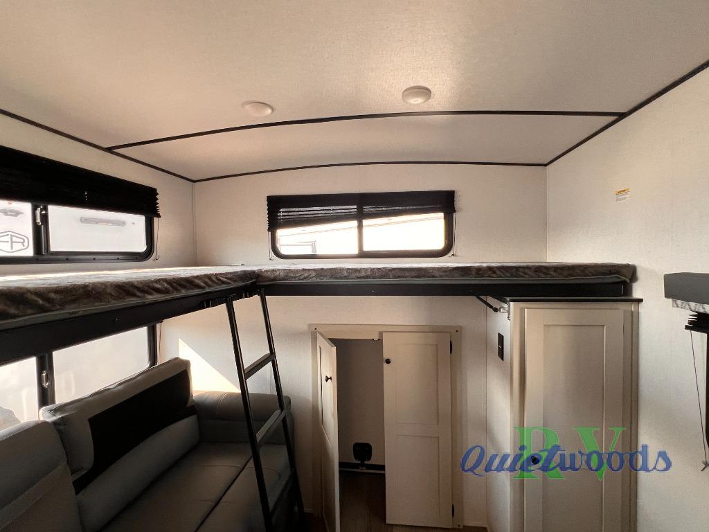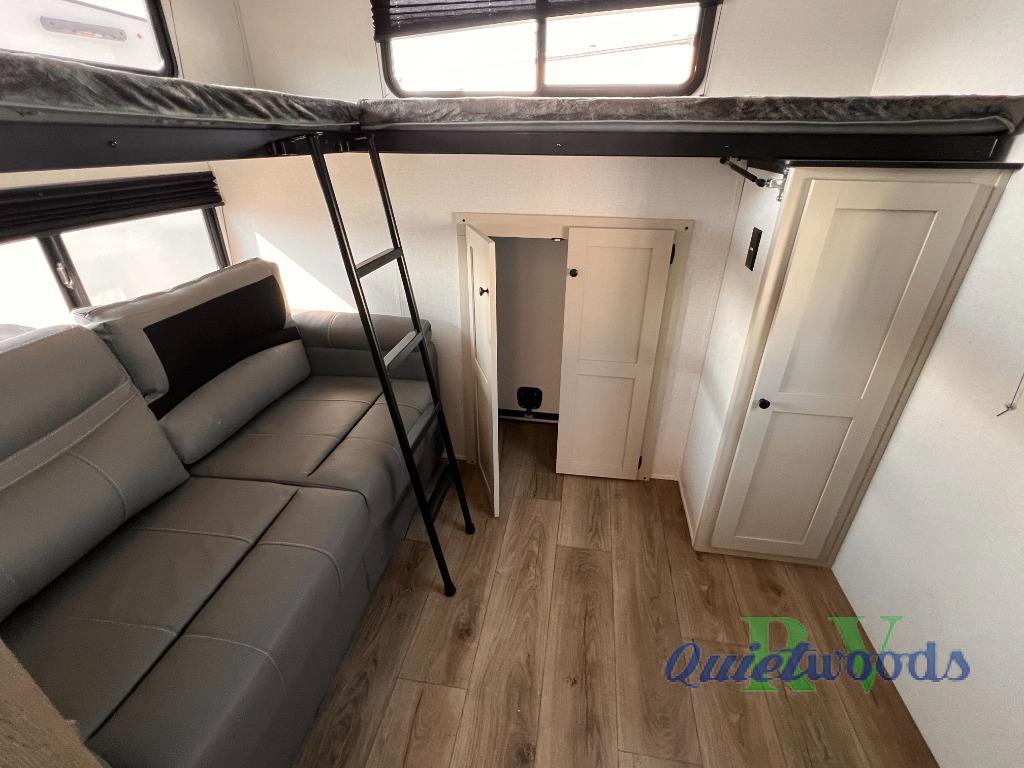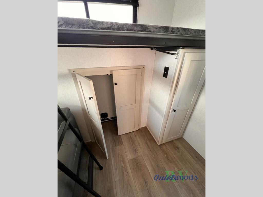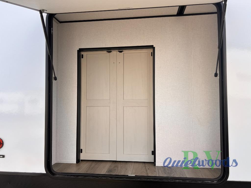 This travel trailer will be perfect to see family and friends in other states or camping for long-periods of time. There is an abundant amount of storage in the living and kitchen area, including behind the entertainment center in the hidden pantry and the second pantry with shelves, plus in the front bedroom under the queen bed with the MAX bed storage system. There is even storage in the rear private bunkhouse cabinet and countertop, plus along the exterior in the pass-through compartment and the Stor-More Cargo in the rear. The side Stor-More cargo door leads you into the bunkhouse to stow items like bikes and totes during travel. You will also love making meals in the kitchen with full amenities, and outside using the camp kitchen. And having dual entry doors just makes everything easy especially getting to the full bathroom.
