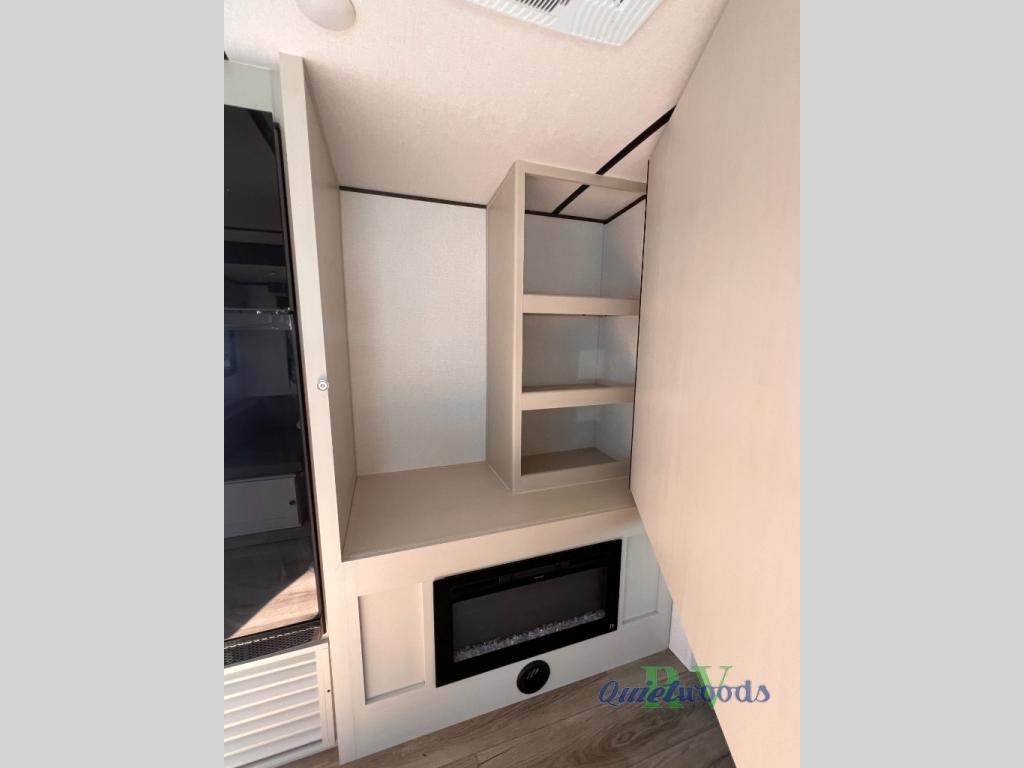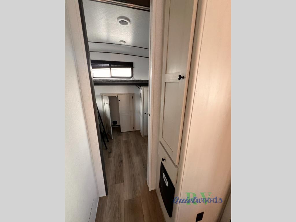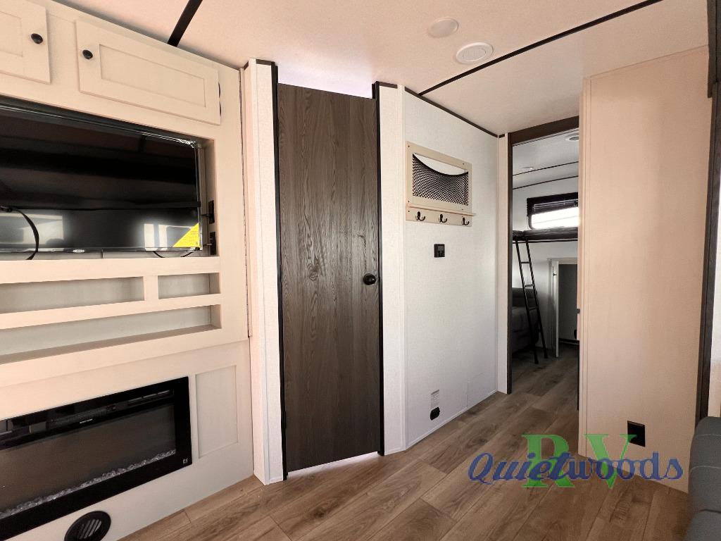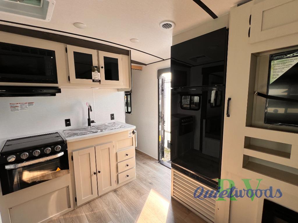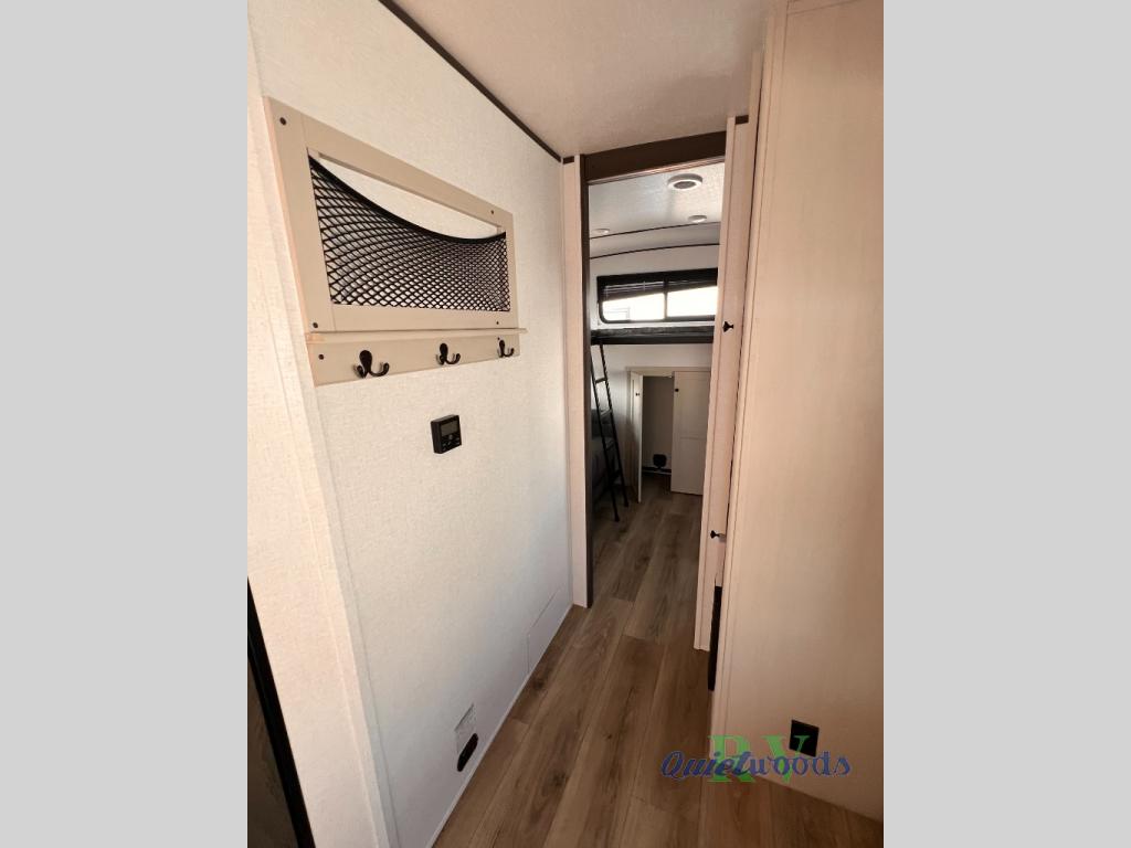 This travel trailer will be perfect to see family and friends in other states or camping for long-periods of time. There is an abundant amount of storage in the living and kitchen area, including behind the entertainment center in the hidden pantry and the second pantry with shelves, plus in the front bedroom under the queen bed with the MAX bed storage system. There is even storage in the rear private bunkhouse cabinet and countertop, plus along the exterior in the pass-through compartment and the Stor-More Cargo in the rear. The side Stor-More cargo door leads you into the bunkhouse to stow items like bikes and totes during travel. You will also love making meals in the kitchen with full amenities, and outside using the camp kitchen. And having dual entry doors just makes everything easy especially getting to the full bathroom.