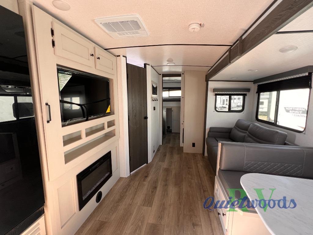 With any Northern Spirit Ultra Lite travel trailer by Coachmen, the "Twice Cool" dual ducted air conditioning system, motion activated floor lights in the bedroom and bathroom, and the motion activated pass-through storage light plus fishing pole storage, will make your camping experience simplified. The heated and enclosed underbelly provides protection on the road and allows you to camp during any season, the 200W solar panel with 30 amp controller provides off-grid camping, and the power tongue jack makes setup easier. Each is built with a front cap with LED strip lights, a laminated, aluminum framed floor, rear wall, and sidewalls, plus 5" trusses with an interior vault. Make your decision today, and camp with everything in its place!