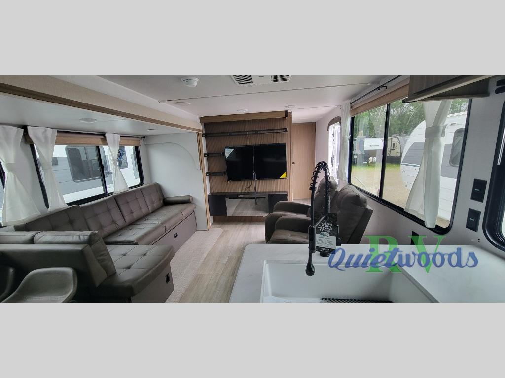 With a spacious kitchen and panoramic windows, this travel trailer is sure to stand out! The L-shaped sofa, dual lounge chairs, and Versa Flex table give you many seating options. You can either cook a delicious meal in the rear kitchen or you can use the exterior camp kitchen to breathe in some fresh air while you cook. After a fun-filled day, you can rinse off in the walk-in shower then head to the front private bedroom, grab your pajamas from the closet, and lay down on the custom king bed with Versa Tilt for a good night's rest!