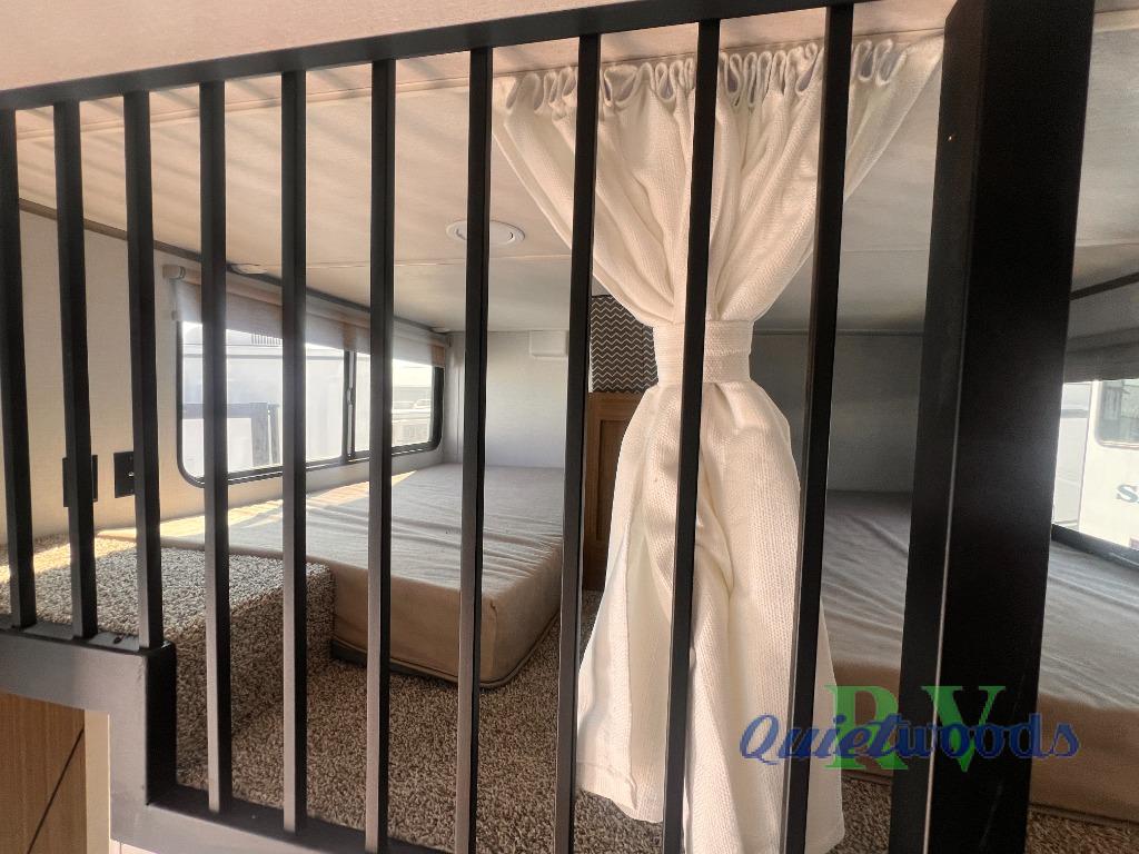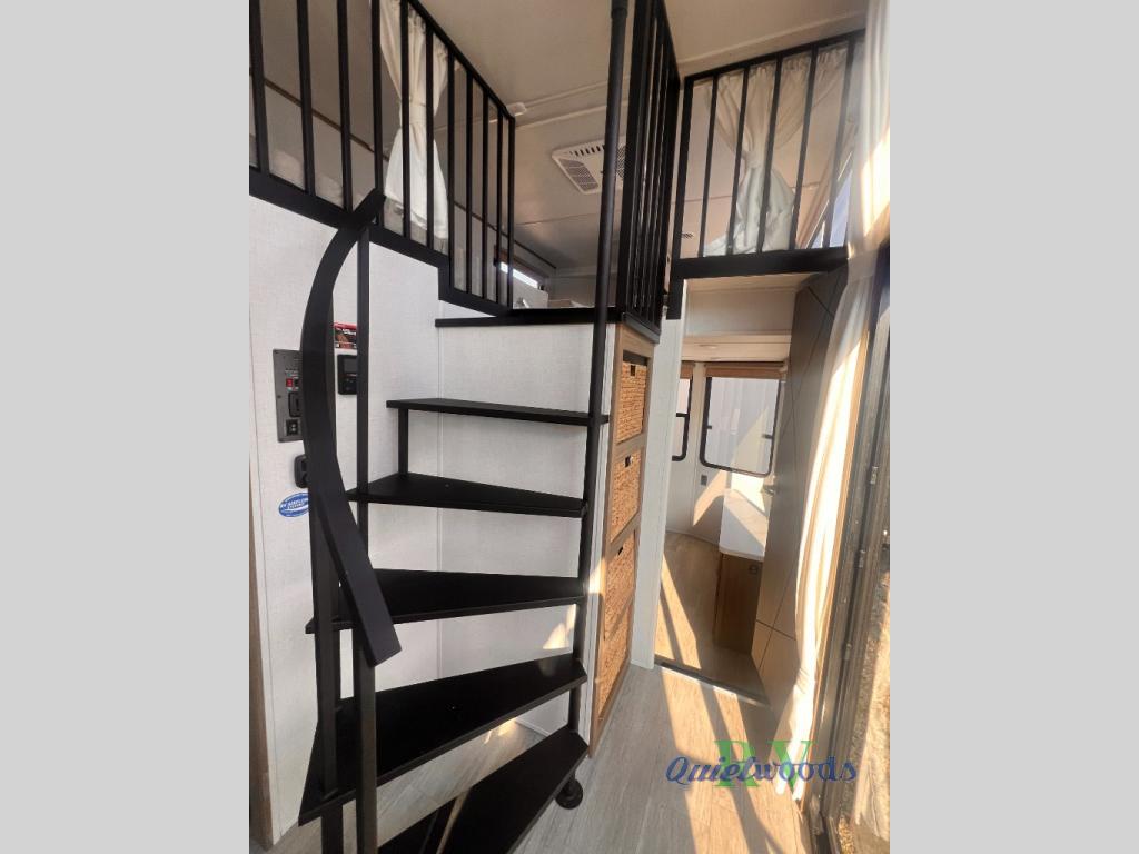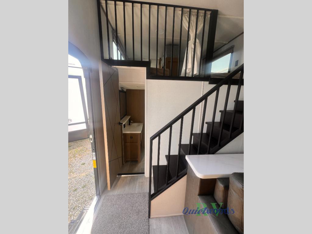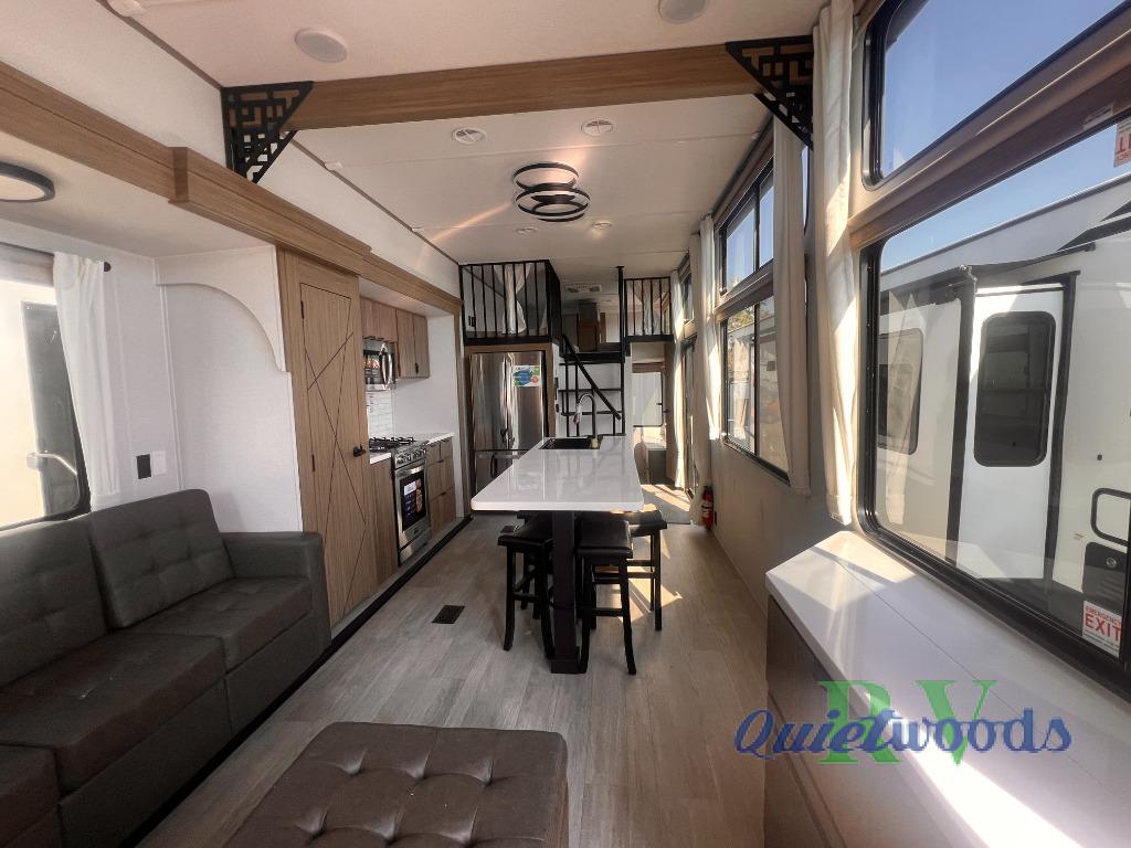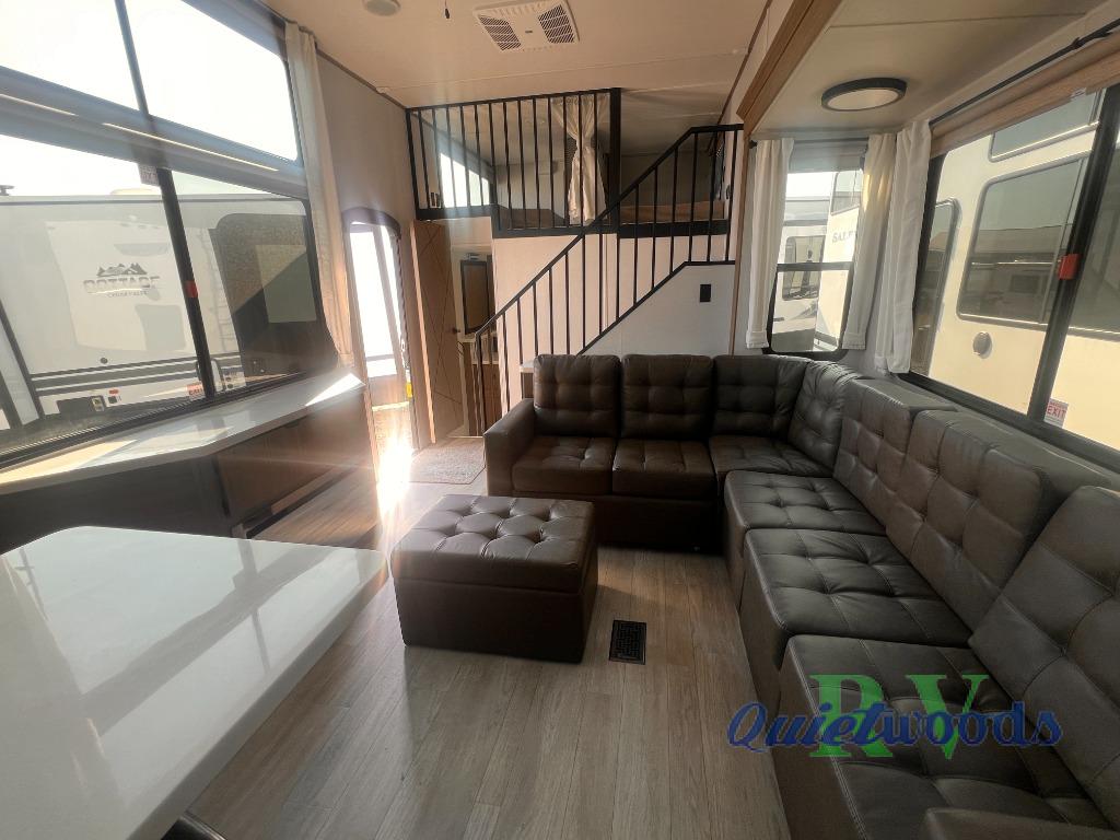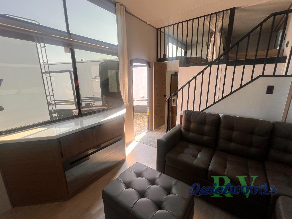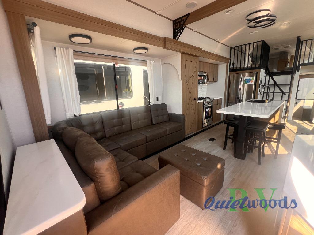 You will feel right at home in this destination trailer! It has not only has one loft in the rear with two 42" x 74" bunk mats, but also a second loft in the front with spiral steps leading up to two bunk mats. The front private bedroom features a king bed slide with Versa-Tilt to lay your head on at night with front windows to let in lots of natural lighting and sunshine in the morning. Relax in true comfort at night on the L-shaped sectional sofa across from the entertainment center with a fireplace. The kitchen island provides extra space to prepare delicious meals and comes with four bar stools to enjoy your breakfast each morning. Everyone will stay fresh and clean with a walk-in shower in the rear private bedroom, plus there is washer and dryer prep if you choose to add those appliances. Head outside through either the patio door or the second entry/exit door each day!
