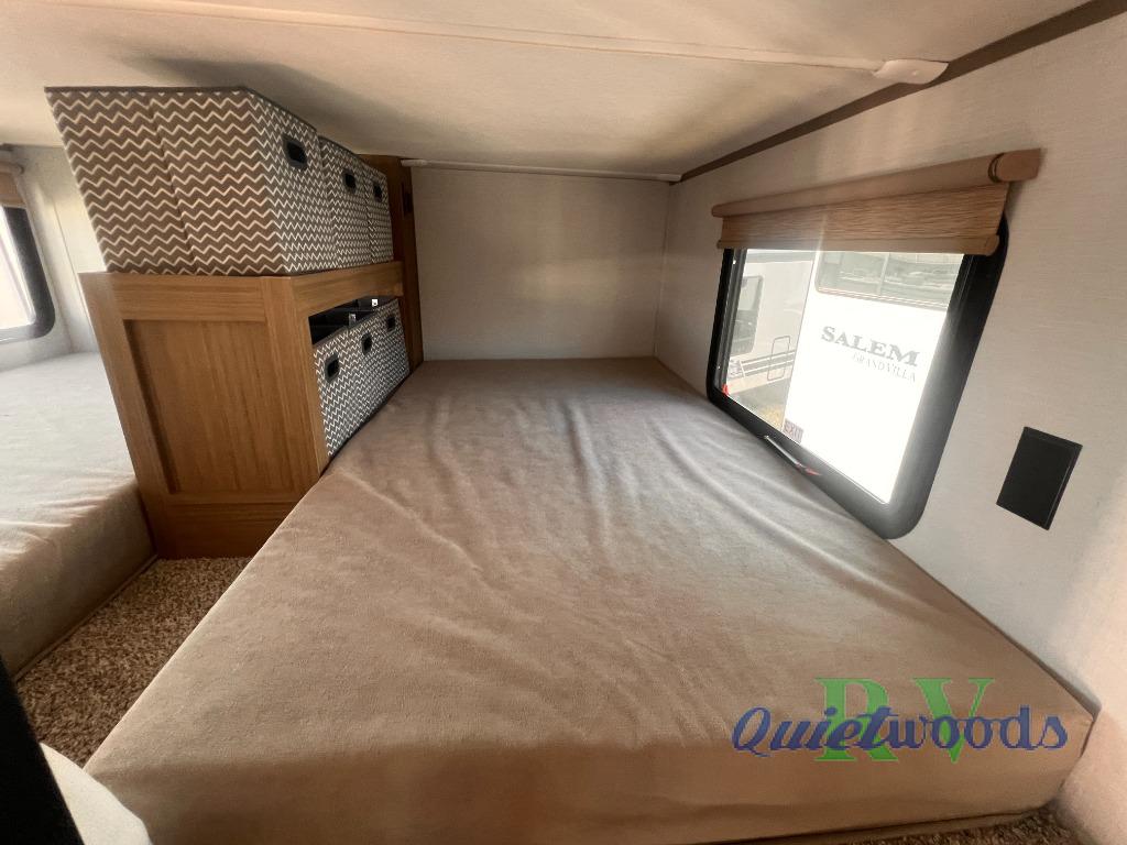 With any Salem Grand Villa destination trailer by Forest River, you can call home wherever you park it! There is a heated and enclosed Accessibelly for added protection in all seasons, LED "Blade Lighting" under the awning, Lippert On-The-Go ladder prep, plus many more exterior conveniences. Elegant curtain rods and curtains will have you feeling right at home, along with stainless steel kitchen appliances, stylish roller shades, and enhanced floating shelves for added storage. Each model includes a central vacuum with a sweep attachment to help keep your space tidy, a 60k on-demand tankless water heater for endless hot showers, a JBL 3-Zone media center, plus available options to further customize your trailer.
