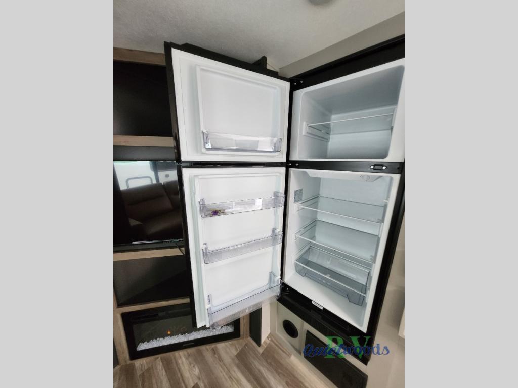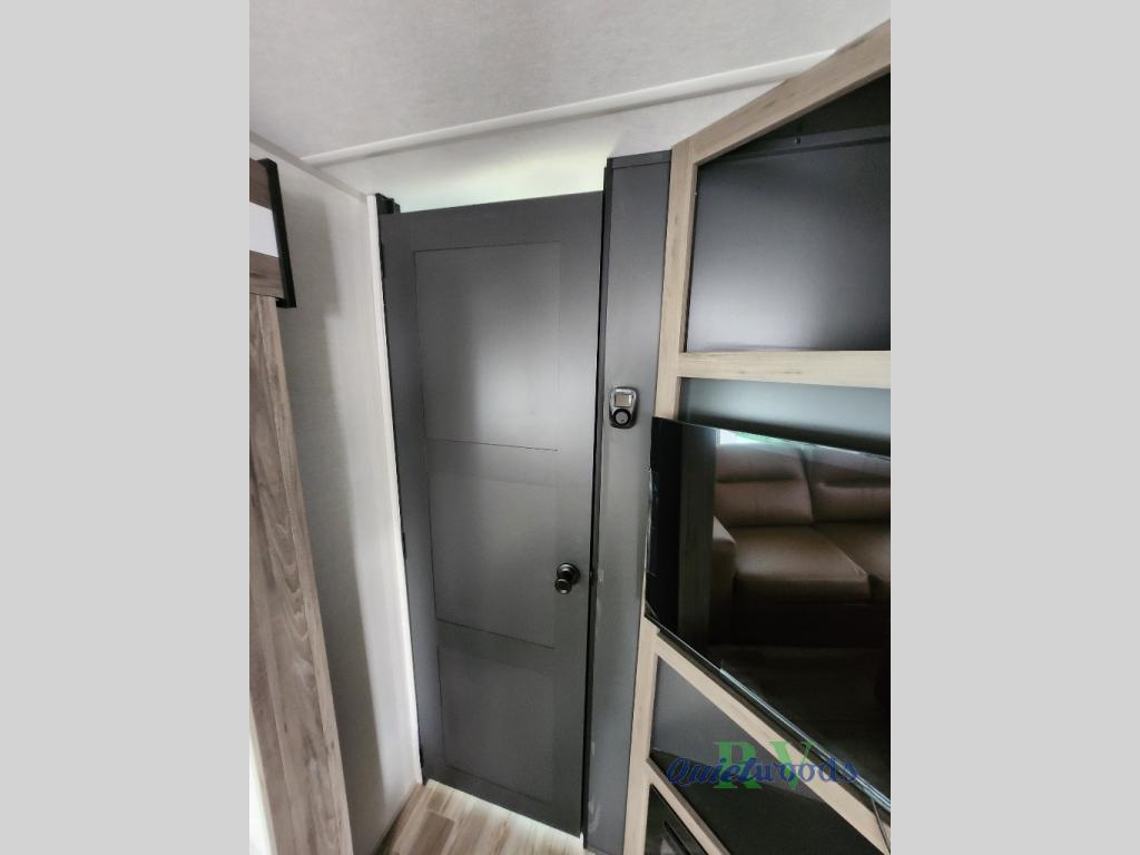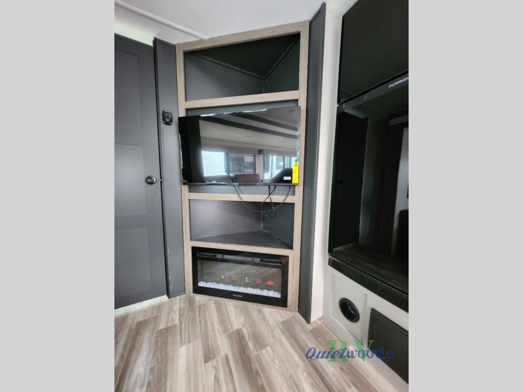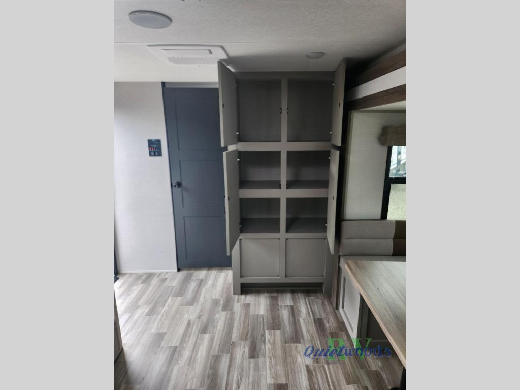 You will love camping every other weekend in this spacious travel trailer. There is a full rear bath with a spacious shower and linen closet for towels and toiletries. Your crew can get comfortable on the theater seating across from the entertainment center, and it even swings open to reveal hidden pantry storage. Easily prepare your meals in the kitchen on the three burner cooktop, or in the oven. There is also a 12V refrigerator, plus a microwave for meals on the go. When you're ready to call it a night, the front private bedroom is sure to provide comfort with its custom king bed, wardrobe, and underbed storage.