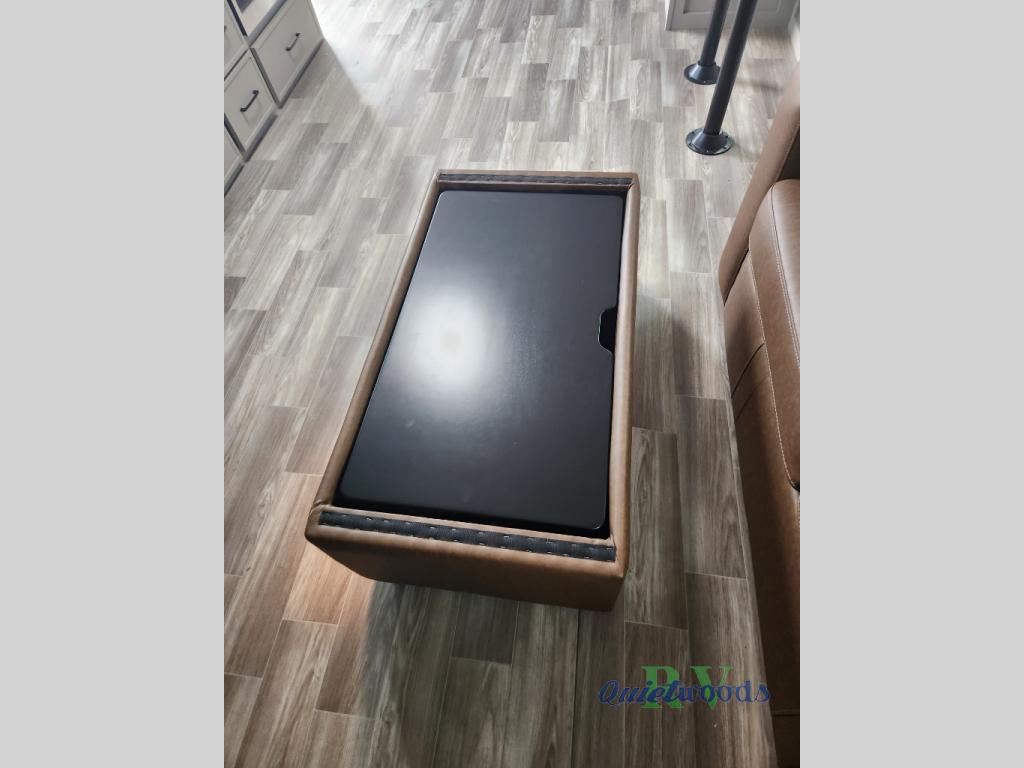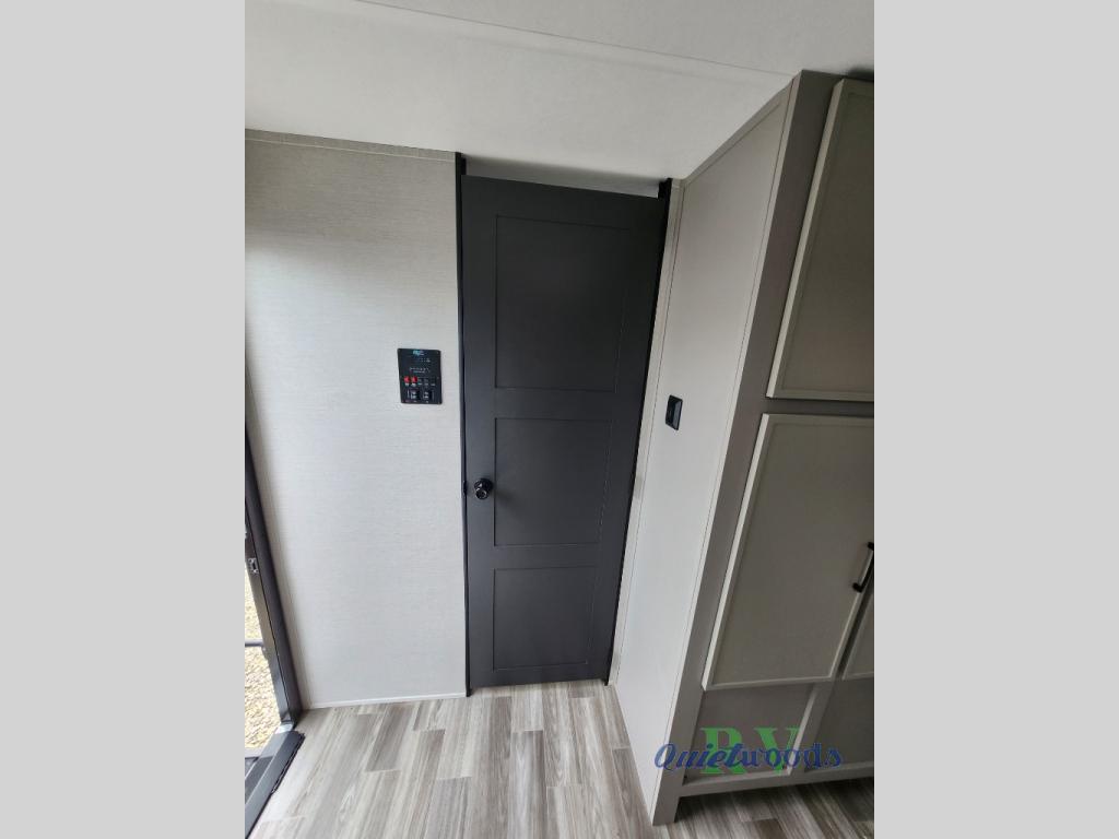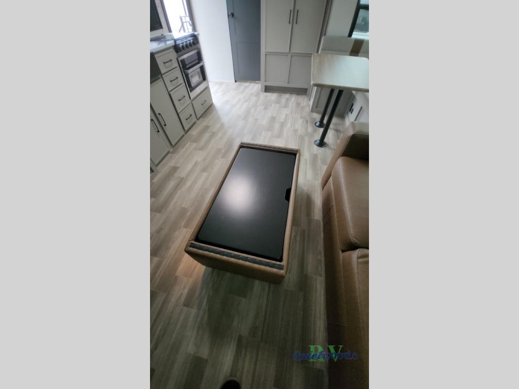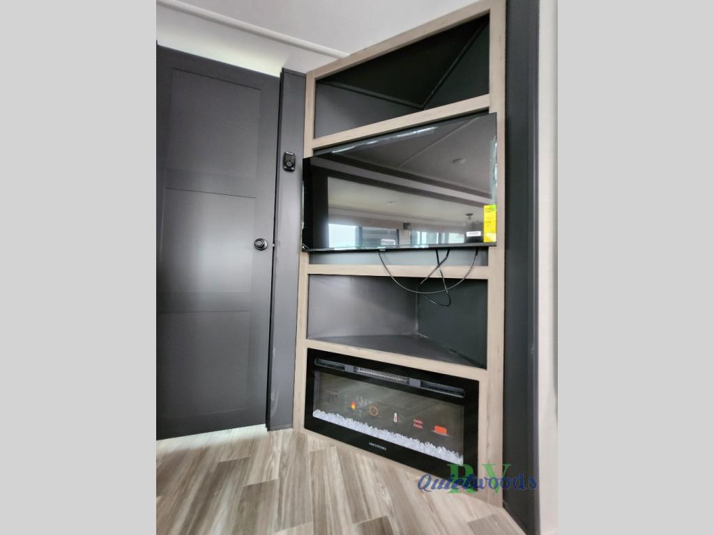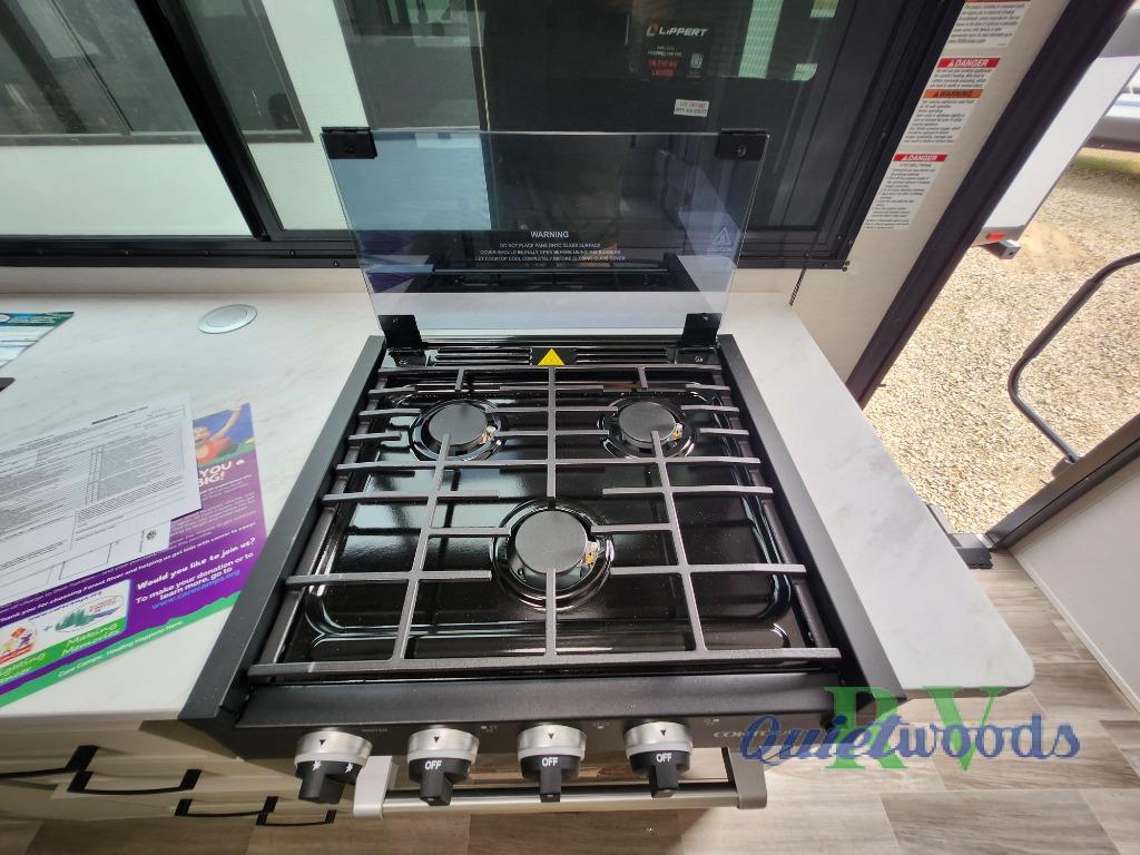 You will love camping every other weekend in this spacious travel trailer. There is a full rear bath with a spacious shower and linen closet for towels and toiletries. Your crew can get comfortable on the theater seating across from the entertainment center, and it even swings open to reveal hidden pantry storage. Easily prepare your meals in the kitchen on the three burner cooktop, or in the oven. There is also a 12V refrigerator, plus a microwave for meals on the go. When you're ready to call it a night, the front private bedroom is sure to provide comfort with its custom king bed, wardrobe, and underbed storage.