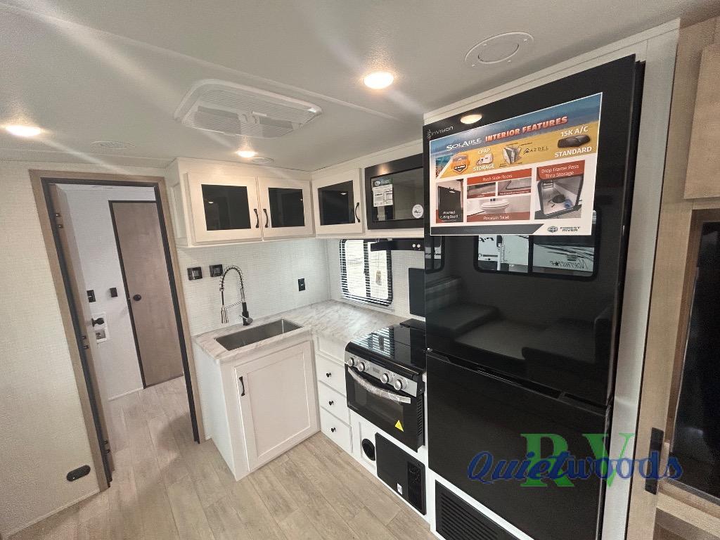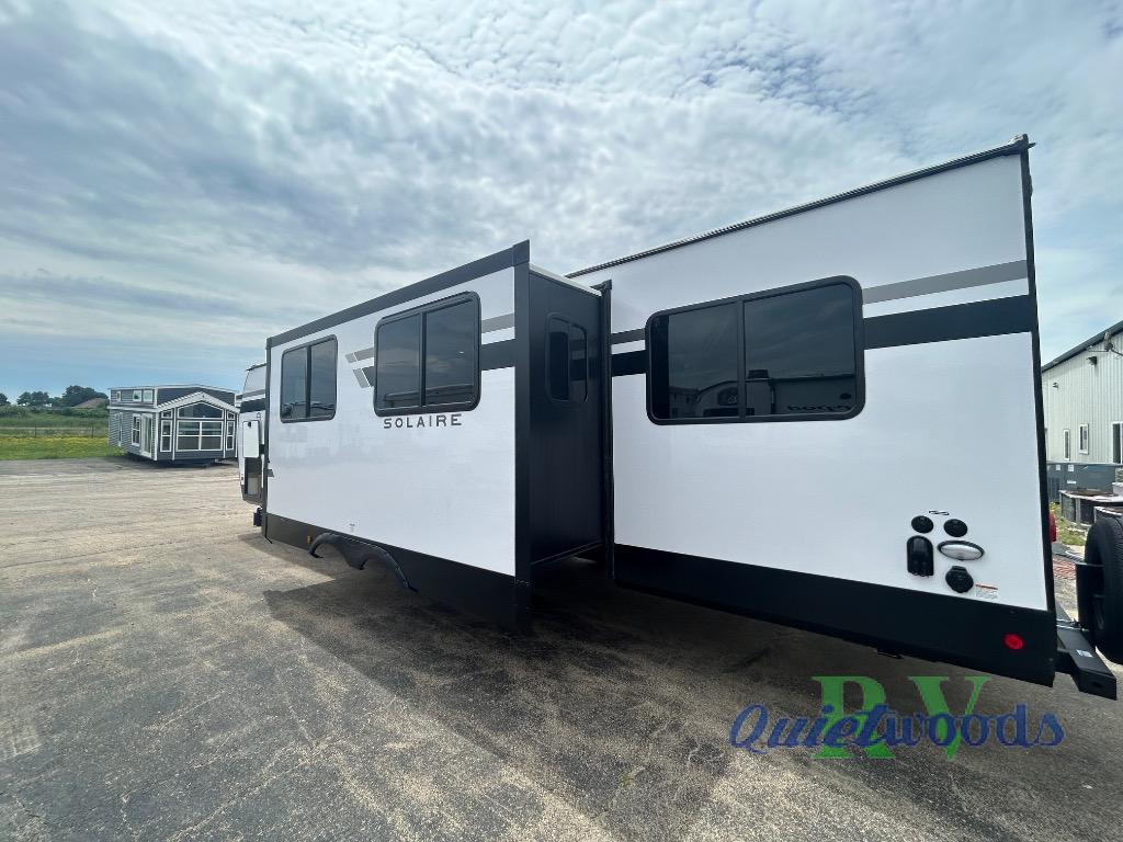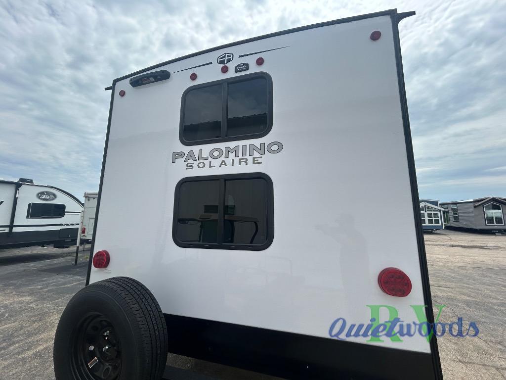 Each SolAire travel trailer by Palomino features a white gel coat exterior and an aluminum superstructure frame for lightweight towing. You will love having a power tongue jack for easy set up, plus slam latch baggage doors with magnets to make unloading easier than ever. There is also a power awning with LED lights and aluminum wheels included on the exterior. Each SolAire is constructed to last with Azdel composite, a fully laminated rear wall and roof, plus a fully enclosed and heated underbelly. The interior includes roller shades and kitchen backsplash, USB ports to keep your electronics charged, a Bluetooth stereo with speakers, and many more stand-out features!
