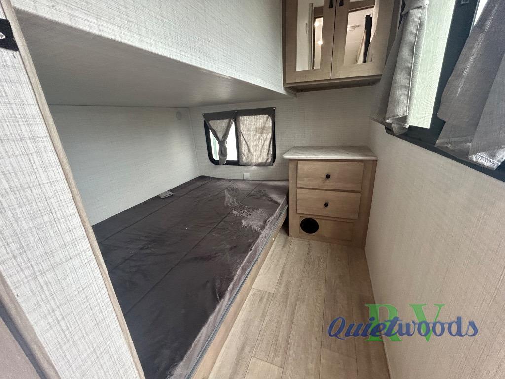 Whether you are looking for a bunkhouse, a private bedroom, or dual entry doors in your next RV, this one might just be the perfect fit with all those features! There are 45" x 72" bunk beds, each with their own wardrobe and their own private entry door, making it perfect for camping with older kids. The galley kitchen offers amenities such as a microwave, cooktop, an 11 cu. ft. refrigerator, and an L-shaped counter for preparing and serving meals. You will also find more storage, an entertainment center and a slide out sofa sleeper and booth dinette that offer more sleeping space when needed.