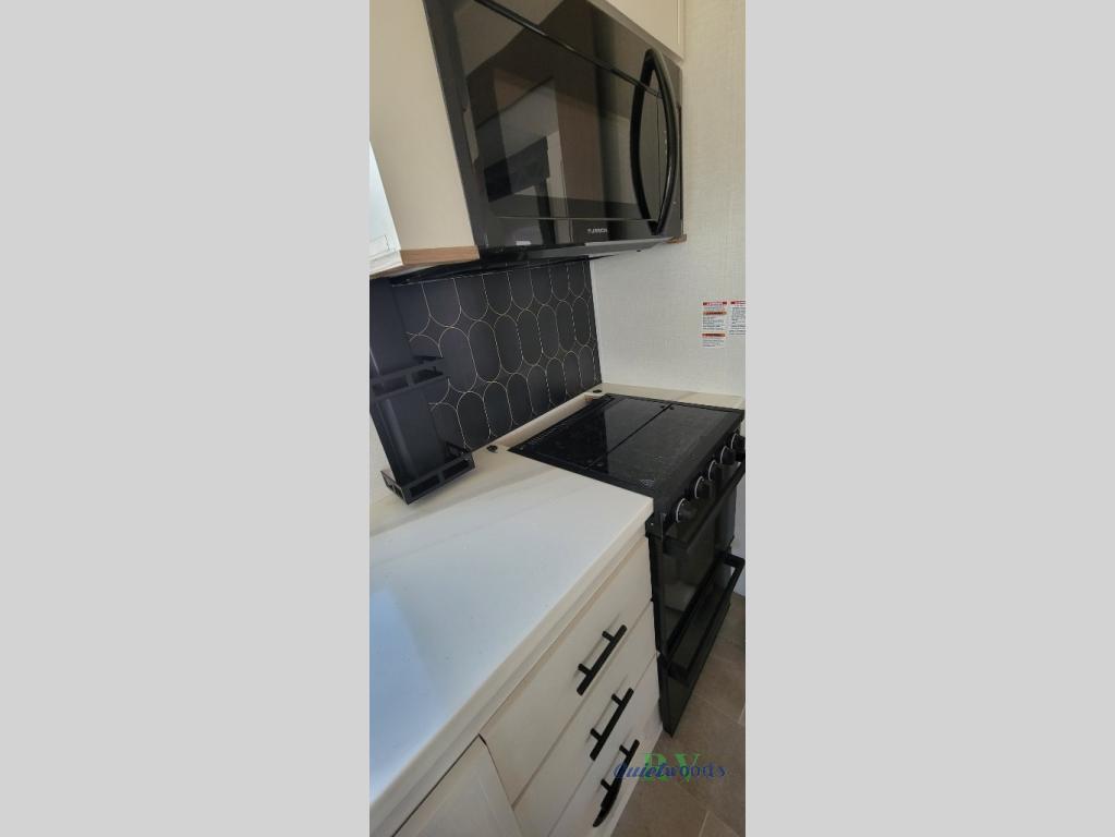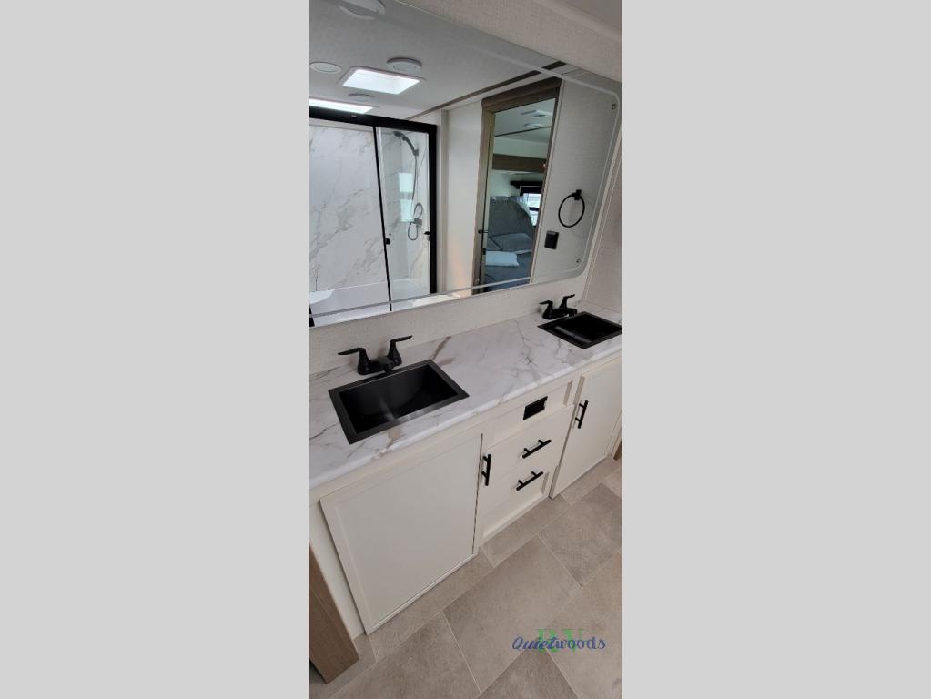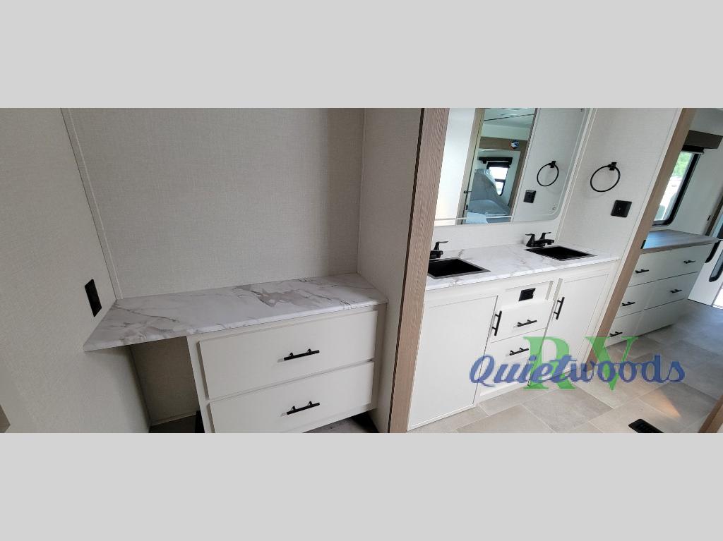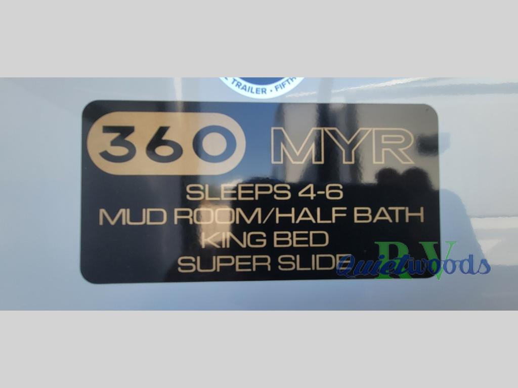 It's easy to see why this fifth wheel was voted Best New Model for 2025 by RV Pro! There are many residential features, such as a middle table with four seats, dual recliners, a desk to get some work done, and a master bedroom you are sure to love. You'll find a king bed with Versa Tilt technology, a dresser, and TV prep. A front master bath includes a walk-in shower with a skylight, dual bath sinks with a back-lit mirror, and a closet with shelves. The middle mud room includes washer/dryer prep, counter space and a pull-out drying rack to hang up swim clothes, towels, and more. Everyone will enjoy spending time in the main living room that includes dual opposing slides, a tri-fold sofa, and an entertainment center with hidden storage behind. And the chef of your group will love the rear kitchen with its 16 cu. ft. 12V refrigerator and pantry, an oven, and plenty of counter space. Head outdoors to enjoy the two power awnings in the evening!