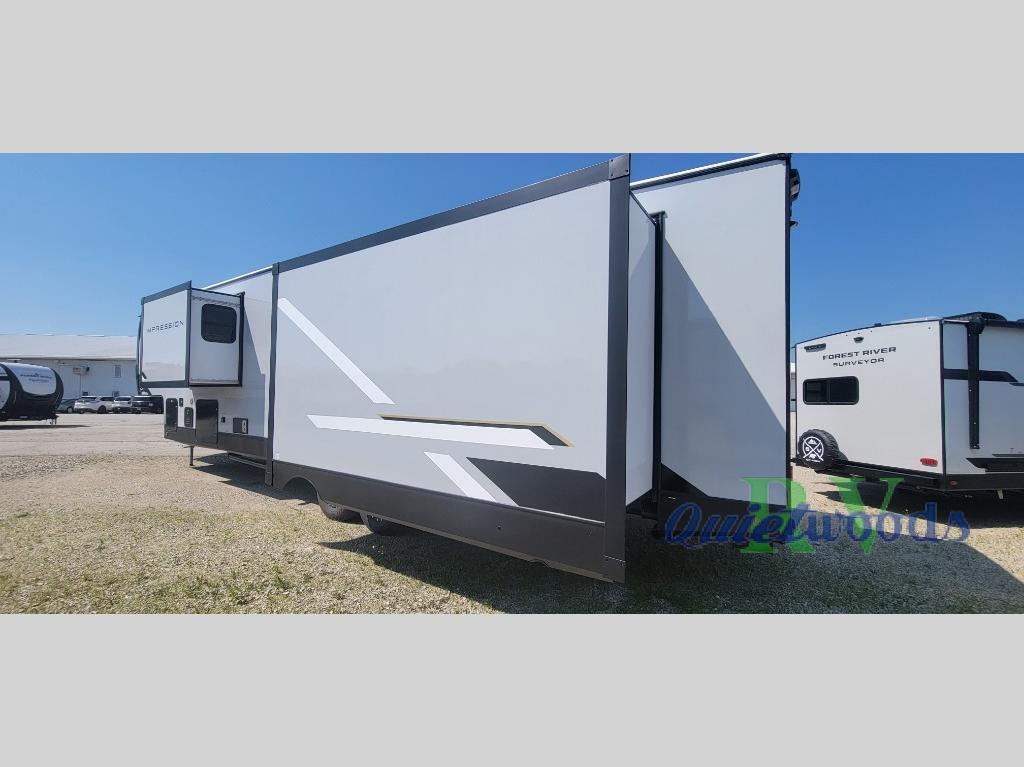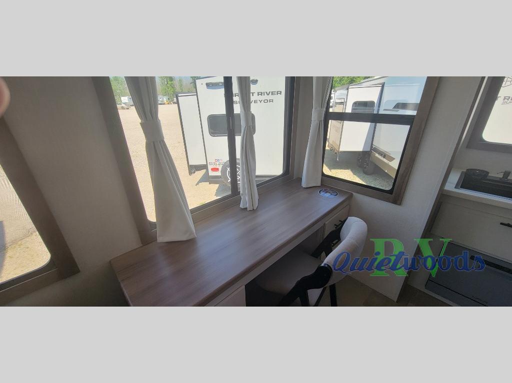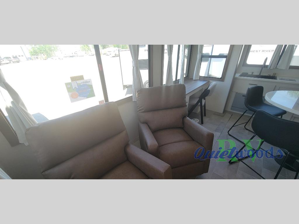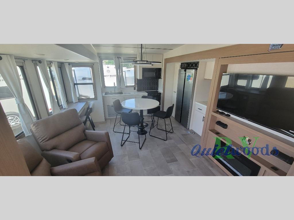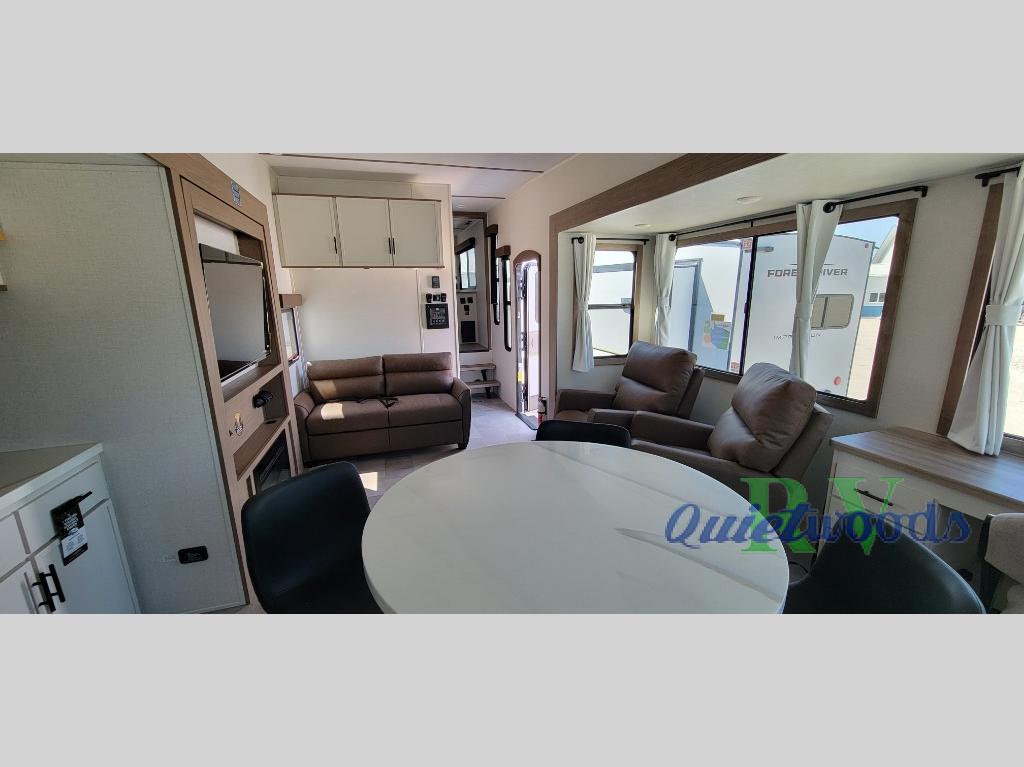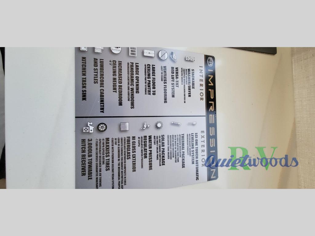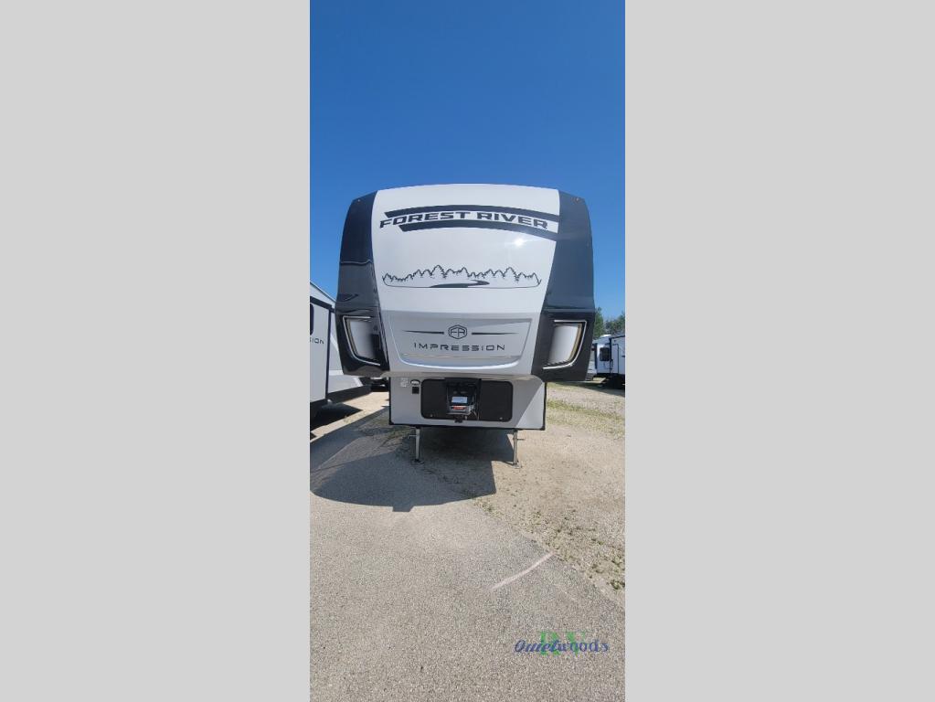 With any Impression mid-profile fifth wheel by Forest River, the focus of the design is comfort and value, built with quality craftsmanship and attention to customer's desires in each Impression! The exterior includes upgraded E-rated tires, custom exterior graphics package, and insulated slam latch baggage doors. There is also an enclosed docking station, an outside shower, and a 100W roof solar panel for off-grid capabilities. The fully heated and enclosed AccessiBelly has removable underbelly panels and offers four seasons of travel, and there is an industry leading 15K A/C plus 35K BTU furnace to keep you comfortable. The interior has lumbercore cabinetry, residential linoleum, residential backsplash in the kitchen, and oversized opening windows in the living area for more natural lighting and good air flow.