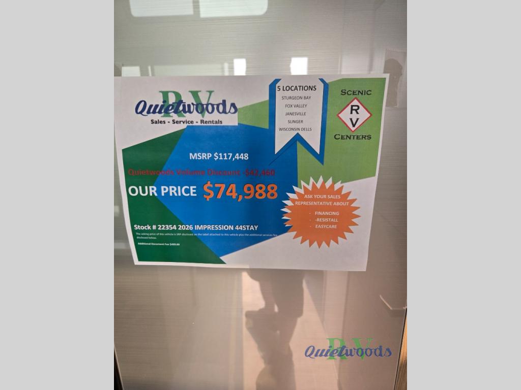 Quietwoods RV Sturgeon Bay is not responsible for any misprints, typos, or errors found in our website pages. Any price listed excludes sales tax, registration tags, and delivery fees. Manufacturer pictures, specifications, and features may be used in place of actual units on our lot. Please contact us @920-743-7121 for availability as our inventory changes rapidly. All calculated payments are an estimate only and do not constitute a commitment that financing or a specific interest rate or term is available.