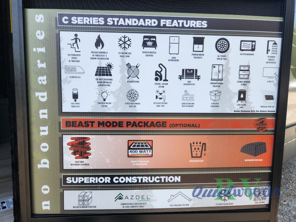 Make your camping dreams come true with this No Boundaries travel trailer! As you enter this unit, you'll notice an entryway pantry that you can use to store your coats and scarves, and the full bathroom is also right in front of the entry door for easy access when you need it. The kitchen has great amenities, like a cooktop and microwave oven, plus a pantry and refrigerator for food storage. And the front queen bed is sure to provide a great night's rest. When the optional Beast Mode Package on this model is chosen, you'll enjoy a 400-watt solar package, a fresh water filter, a Maxxair roof vent cover, plus a Beast Mode independent suspension for better handling.