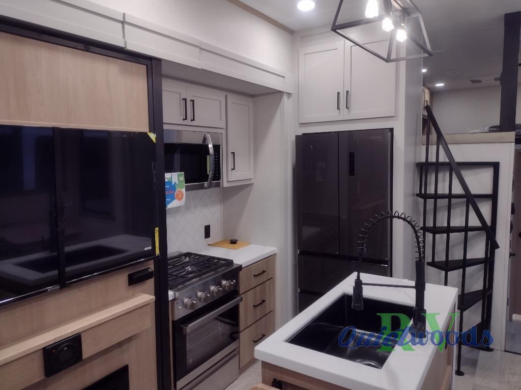 You won't believe the comfort and convenience found in this destination trailer. There are two private bedrooms; one up front with a queen bed slide out and storage space, and one in back with a queen bed slide out and a half bath! There is even washer and dryer prep here if you want to add those appliances and the second entry door is also found in this location so you can easily slip out in the morning. Above each of these rooms is a loft providing three total bunk mats for sleeping, storage cabinets, and TV prep if you want to add entertainment. Everyone can meet in the combined kitchen and living room that includes dual opposing slides, a 60" theater seating across from a 50" flat screen TV and fireplace, plus a free-standing table with chairs and a bench to dine at. The chef of your group will love the large kitchen island, Chef Collection three burner range, and a 16.2 cu. ft. refrigerator for food storage.
