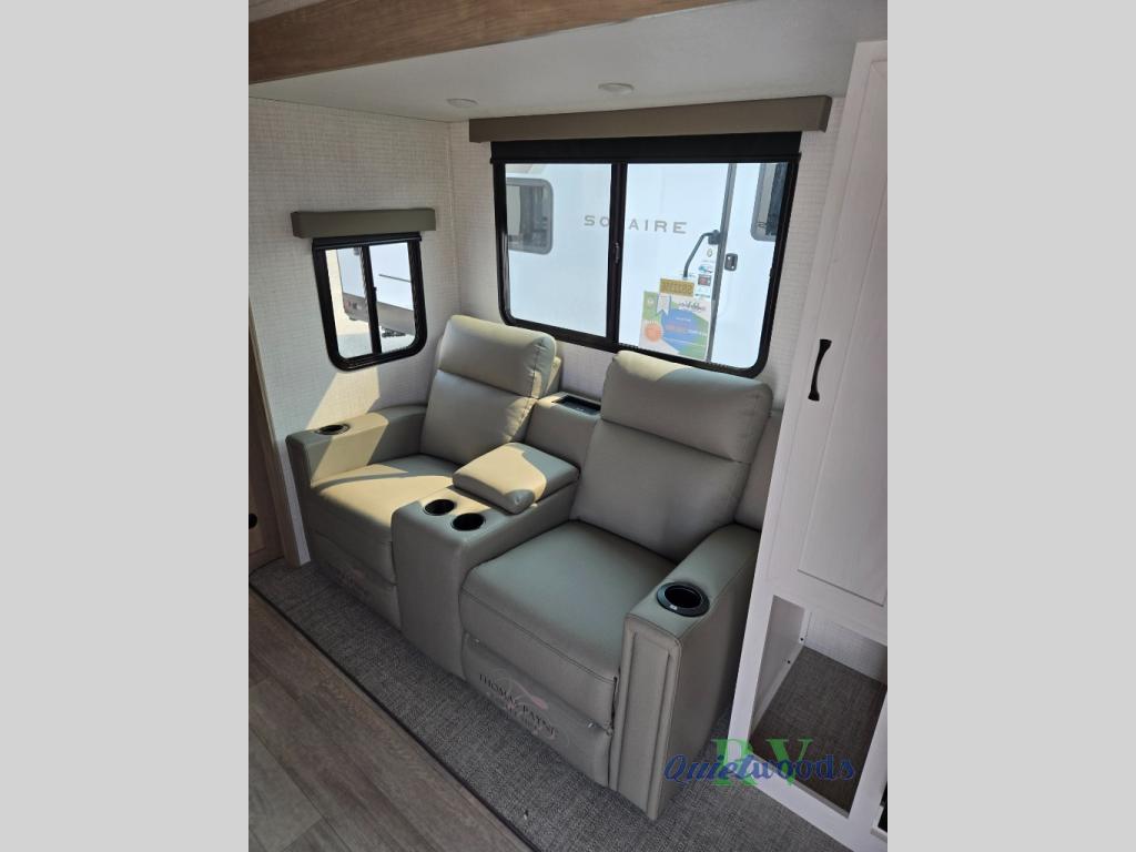 This couple's trailer is perfect for weekend trips to the campground. You can relax inside on the theater seats that are within a large slide out, and there is a hidden pantry behind the entertainment center to keep snacks stocked. The full rear bathroom gives you the space you need as well as a shower with a seat plus washer and dryer prep. And the front bedroom provides a queen bed, dual wardrobes and privacy.