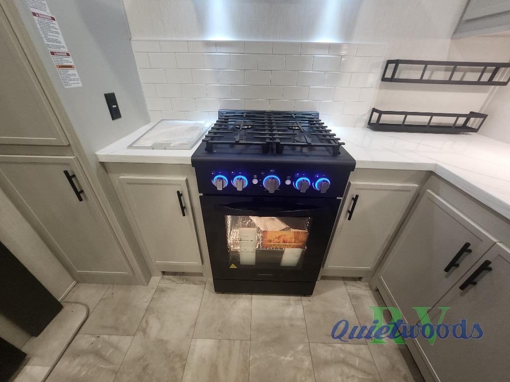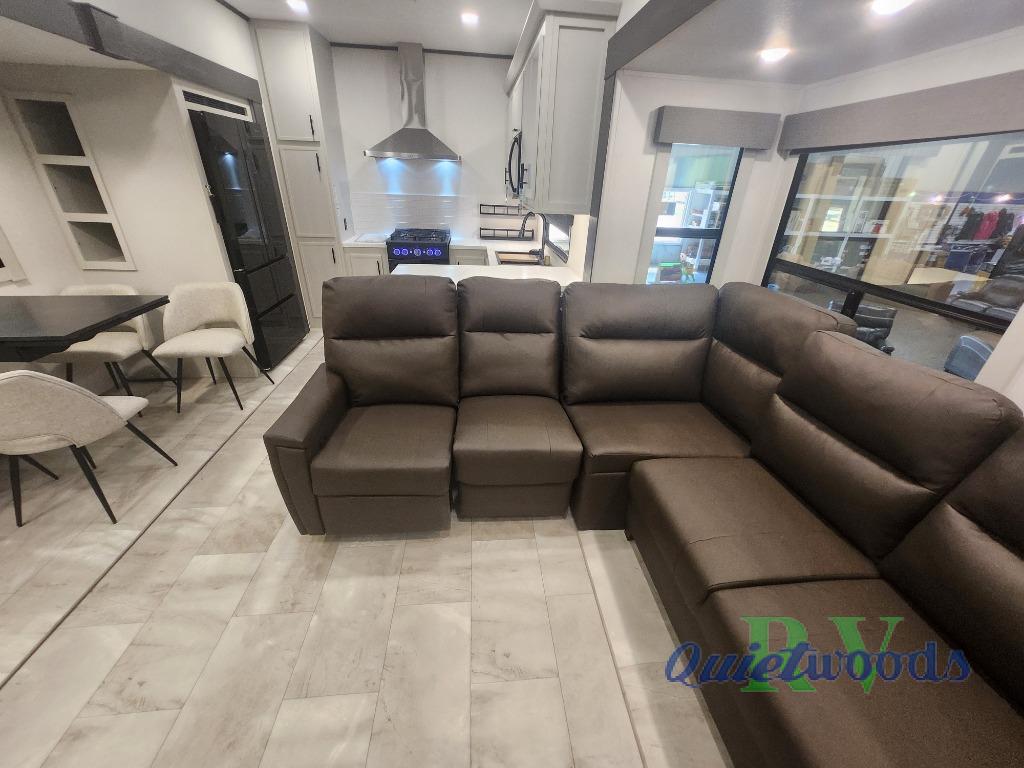 One of the standout features of the 38LAUNDRY fifth wheel is the convenient stackable washer and dryer located in the half bath, letting you take care of laundry right from the comfort of your trailer, no campground laundromat needed. After a day full of outdoor adventures, everyone can relax together in the spacious living room, which features a large sectional sleeper sofa perfect for movie nights or extra sleeping space. The equipped kitchen includes a four-burner range, giving the chef plenty of room to cook up delicious meals with ease. And when it's time to unwind, the private bedroom offers a peaceful retreat complete with a walk-through private bathroom featuring a dual vanity and a generous walk-in closet, ideal for storing all your clothes and camping gear.