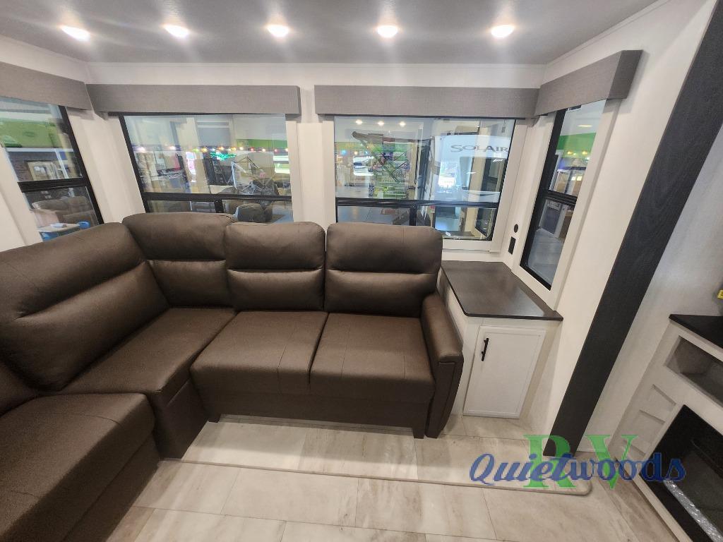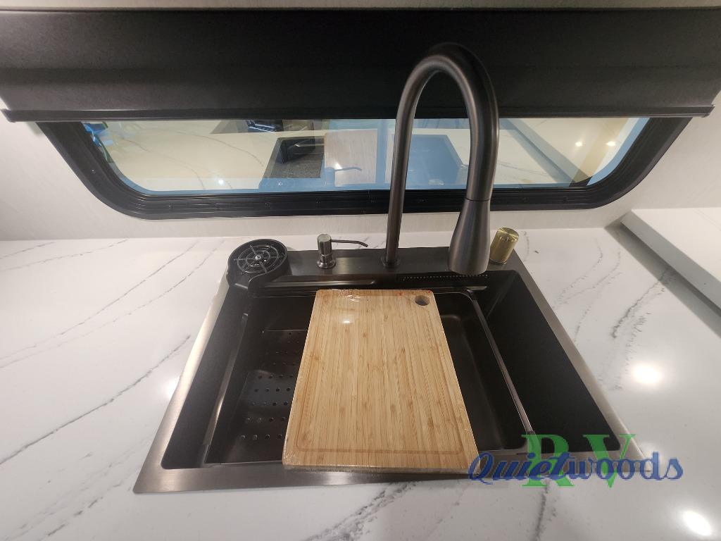 The Sanibel series stands out with a combination of unique and highly functional exterior and interior features designed for both convenience and durability. On the outside, a drop-frame pass-through storage area with a rubberized liner offers ample space while protecting your gear from moisture and wear. Setting up camp is effortless thanks to the one-touch auto-leveling system and rubberized suspension equalizer, which provide a smooth and stable foundation. Inside, comfort meets practicality with carpet less slides for easy cleaning and blackout roller shades for privacy and temperature control. The real wood cabinet doors and solid surface countertops add a touch of elegance, no matter where the road takes you.