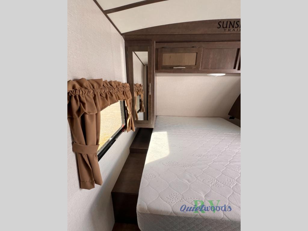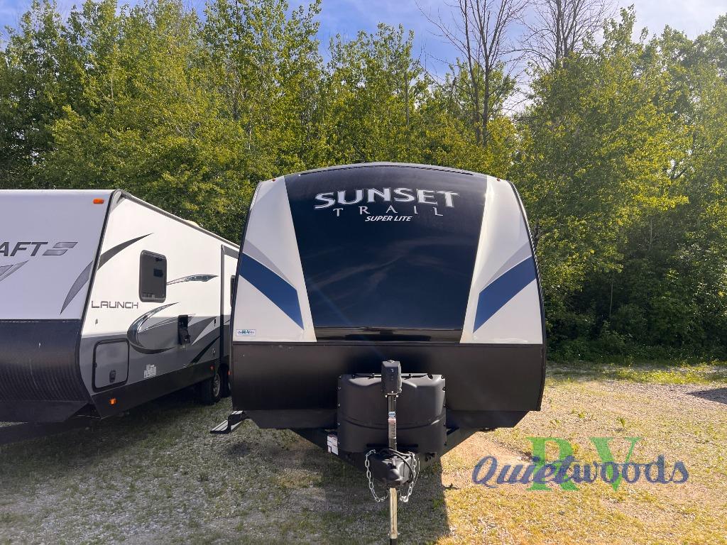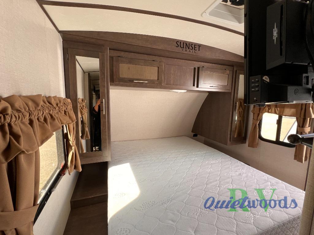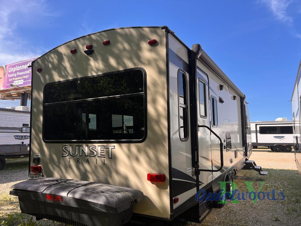 Because of its updated and comfortable style, this Sunset Trail Super Lite travel trailer is the perfect addition to your family's next road trip. With a large bedroom wardrobe and an exterior pass-through storage area with motion-activated LED lights, this trailer gives you the ability to bring along all of your luggage needs, and with enough room to sleep five people, it also gives you the ability to bring along all of your family. The front, private bedroom has been turned into a luxury escape because of its own bathroom and exterior entrances.