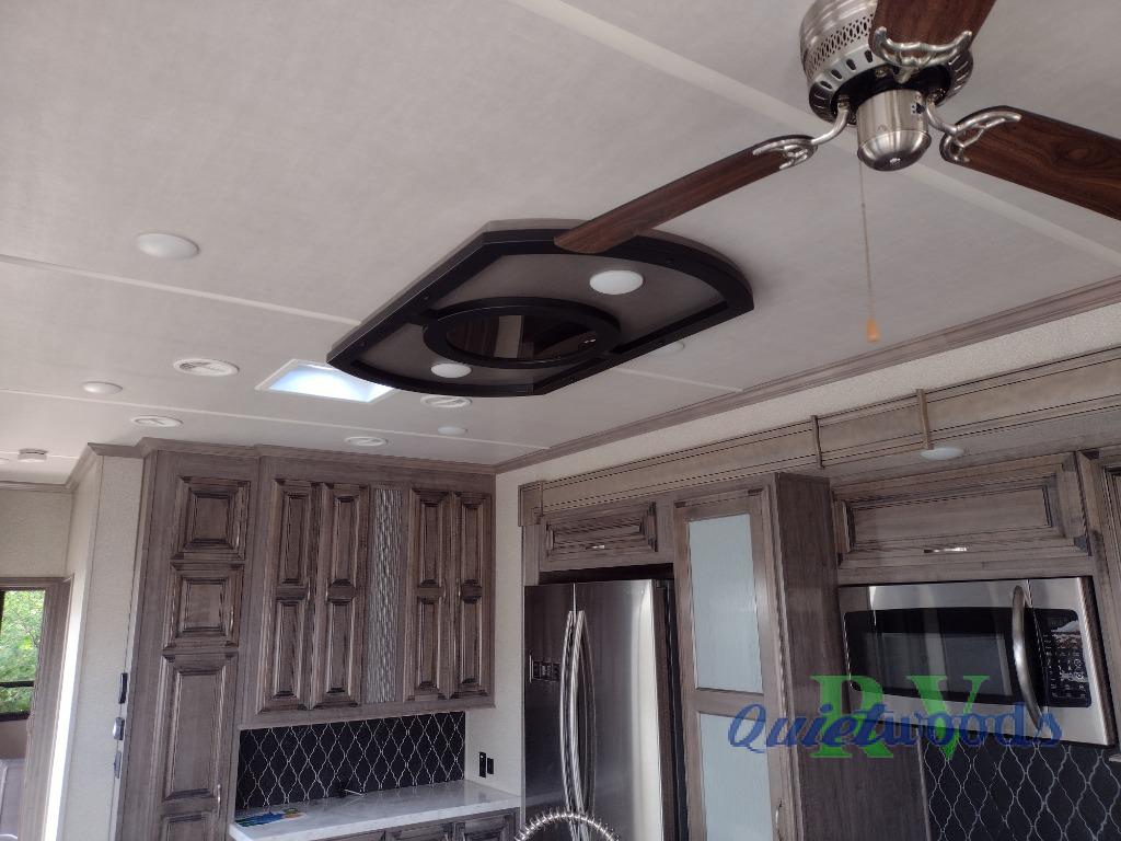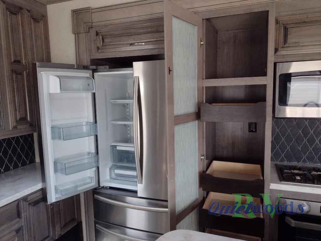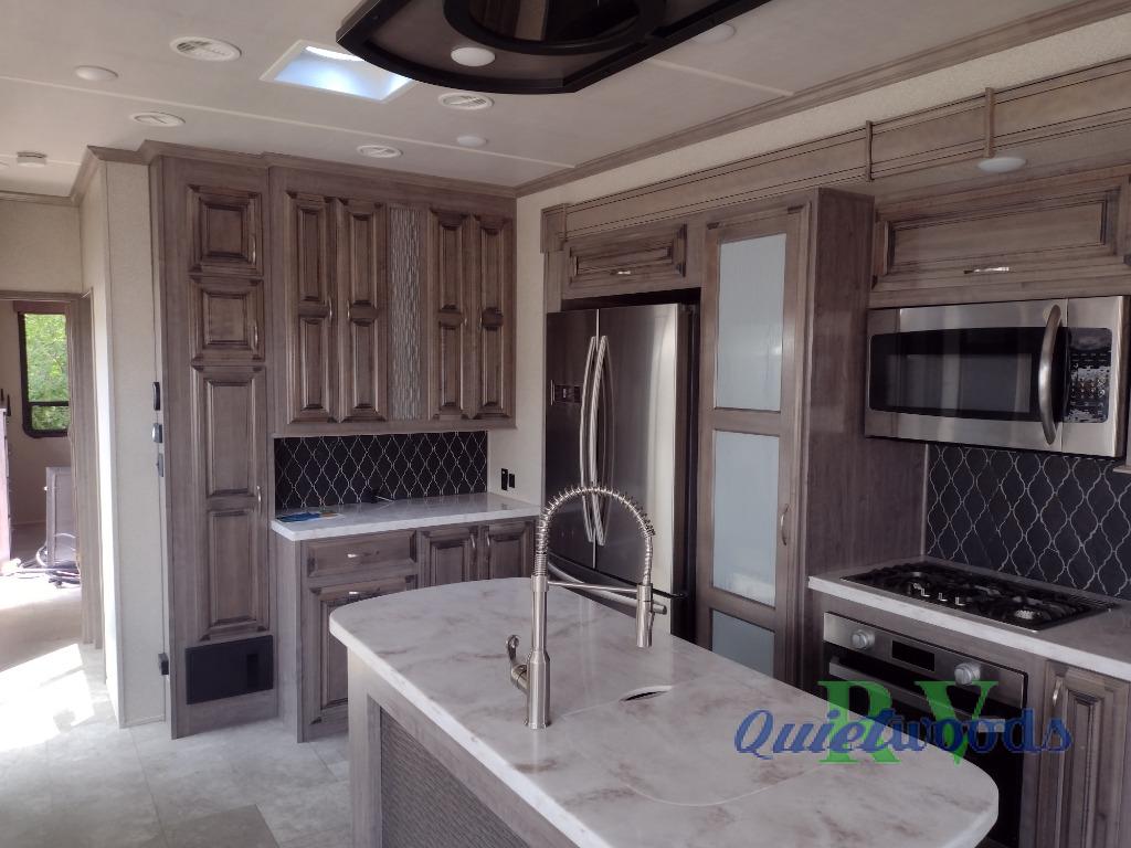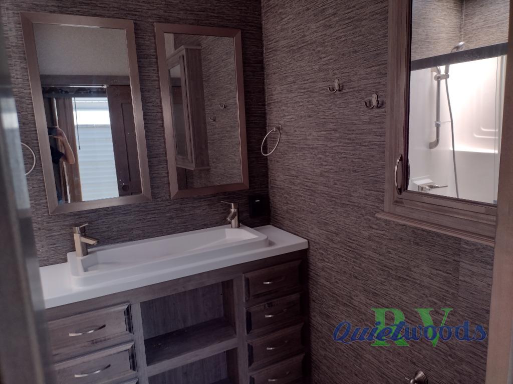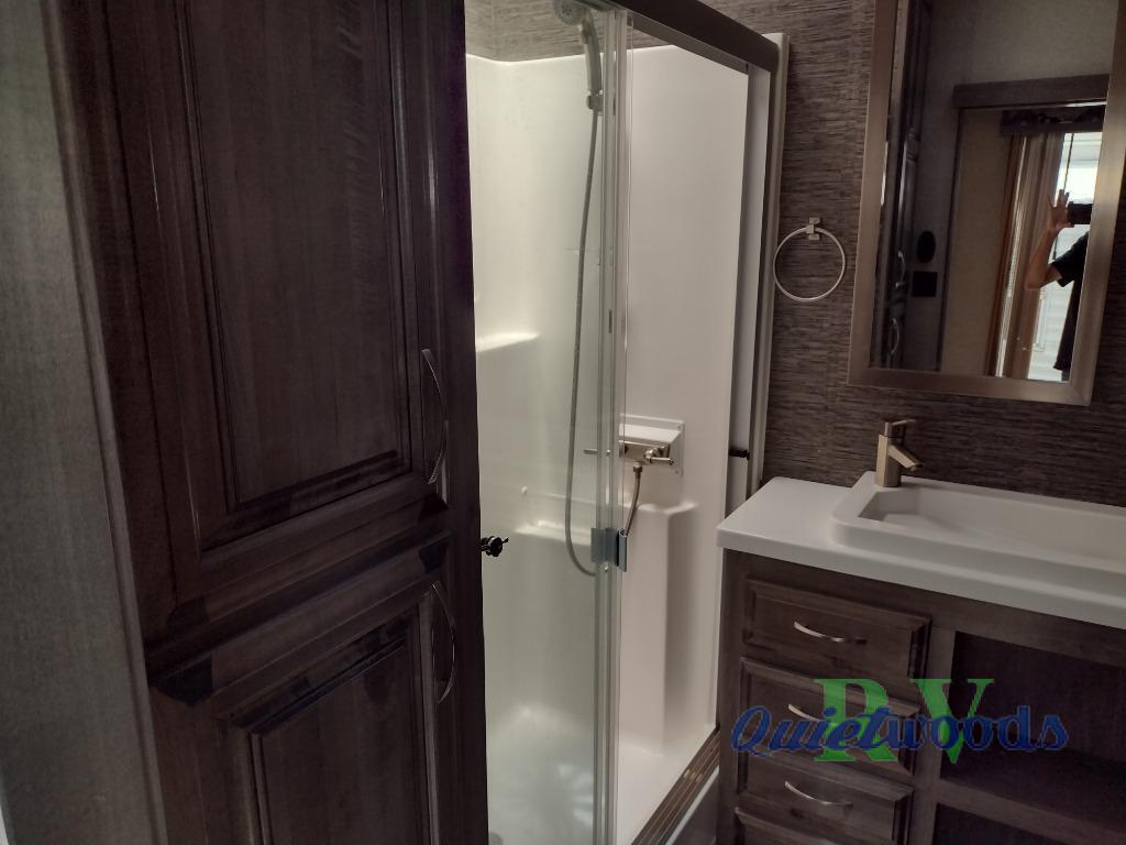 It's time to get away from the hustle and bustle of the city to your favorite destination home with luxury and style around every corner. Just imagine having a Chef's kitchen with a 20 cu. ft. double drawer residential refrigerator and a full pantry to store lots of food for parties, cookouts, and vacations. You will also love the look of the island Infinity light medallion, and the backsplash. The main living area includes enough furniture for any gathering. The impressive bathroom offers a vanity with a single drain and two faucets as well as a one piece shower with a seat. When you are ready for bed, you can retire to the "Champagne Dreamer" king bed mattress after grabbing your pajamas from the nine-drawer, tall boy dresser. You even have a make-up vanity desk. Start camping in luxury today!