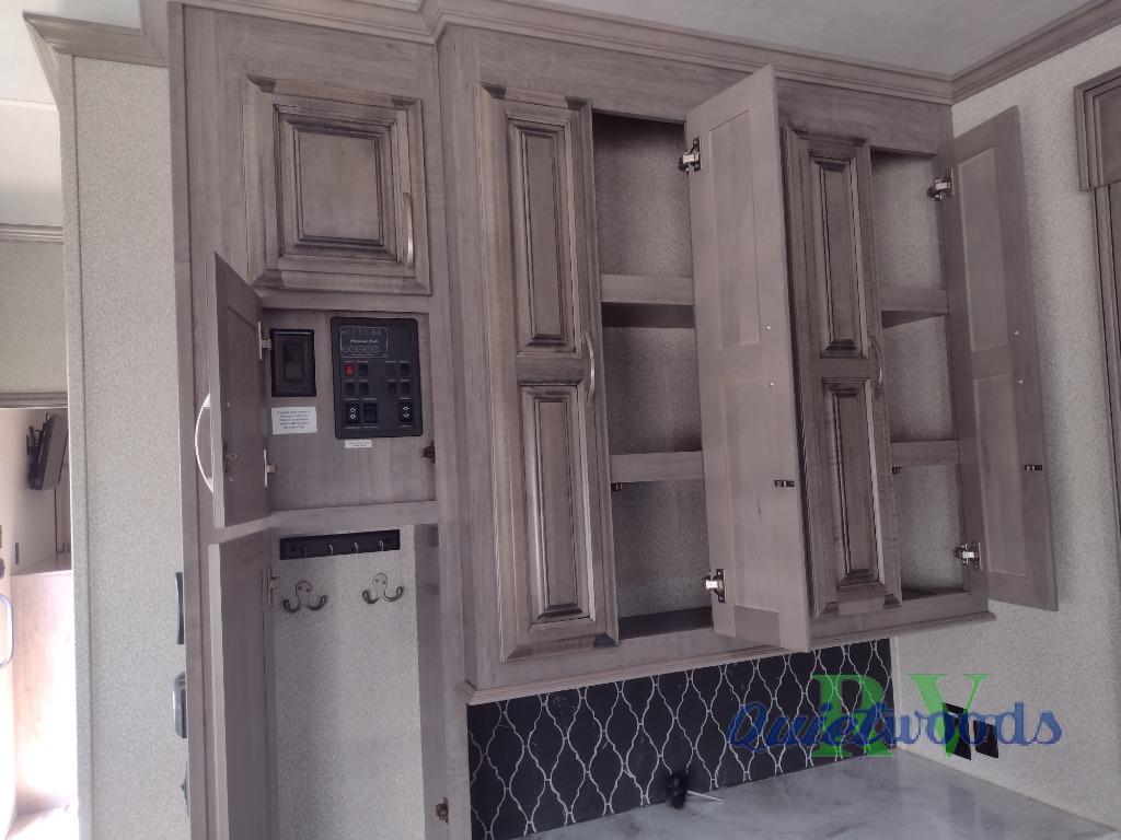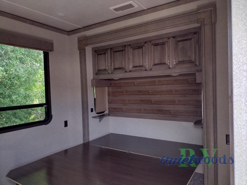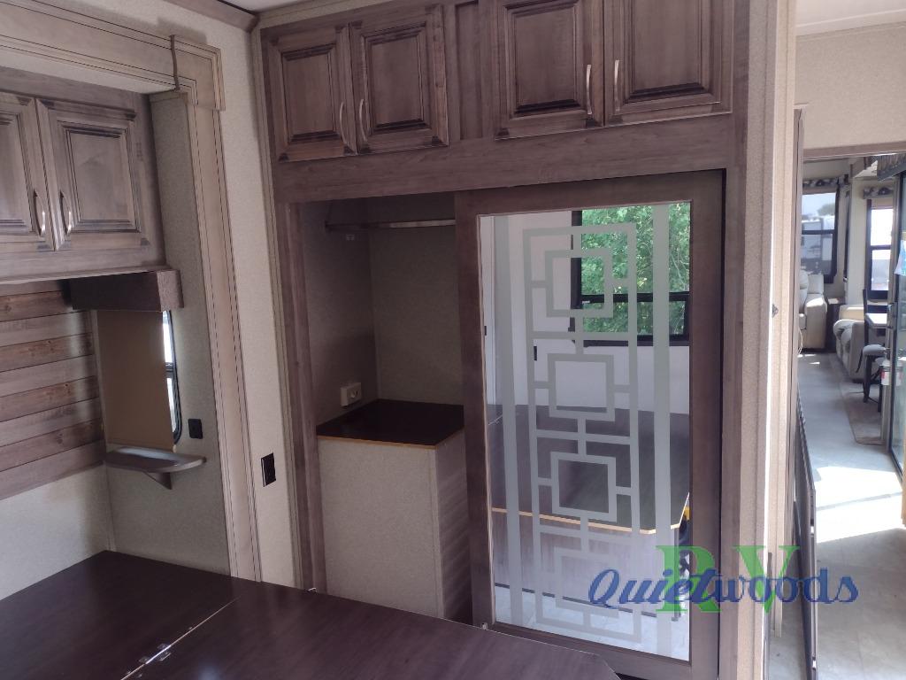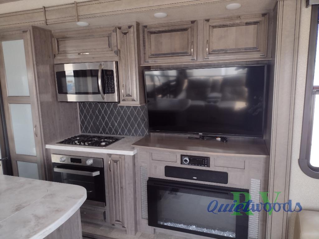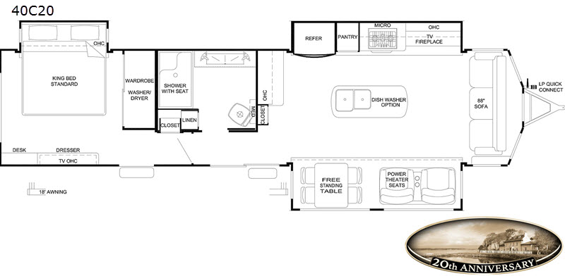 It's time to get away from the hustle and bustle of the city to your favorite destination home with luxury and style around every corner. Just imagine having a Chef's kitchen with a 20 cu. ft. double drawer residential refrigerator and a full pantry to store lots of food for parties, cookouts, and vacations. You will also love the look of the island Infinity light medallion, and the backsplash. The main living area includes enough furniture for any gathering. The impressive bathroom offers a vanity with a single drain and two faucets as well as a one piece shower with a seat. When you are ready for bed, you can retire to the "Champagne Dreamer" king bed mattress after grabbing your pajamas from the nine-drawer, tall boy dresser. You even have a make-up vanity desk. Start camping in luxury today!