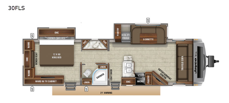 Jayco has made certain that you will stand out from the crowd while traveling in the White Hawk by adding their Magnum Truss Roof System which can withstand up to 4,500 pounds, fifty percent more than the competition. The American-made Goodyear tires with self-adjusting electric brakes are the perfect base to the sleek and aerodynamic exterior. On top of all of that, you will also find an enclosed underbelly with Climate Shield so that nothing will stop you from adventuring during all sorts of weather, and the JAYCOMMAND "Smart RV" system is a wonderful addition that allows you to control various functions of your trailer from the convenience of your smart phone.