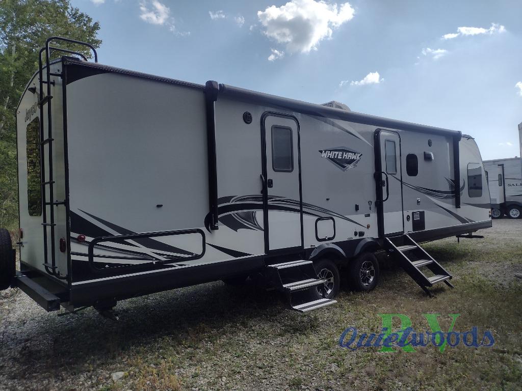 This White Hawk travel trailer is a fantastic unit to have because it provides convenience and comfort all throughout! With the king-size bed in the rear private bedroom, you'll fall asleep effortlessly each night, and because the second entry door has been included in this bedroom, you can even come and go without waking sleeping campers up front. The walk-through bath is also a great addition because it provides extra space with its large size, and it also contains a dual-sink vanity so that two people can wash their hands at the same time. When you enter this trailer from the main entry, you'll find the coat rack to be useful for holding your coats and sweaters, and the tri-fold sofa up front will be a great place to relax.