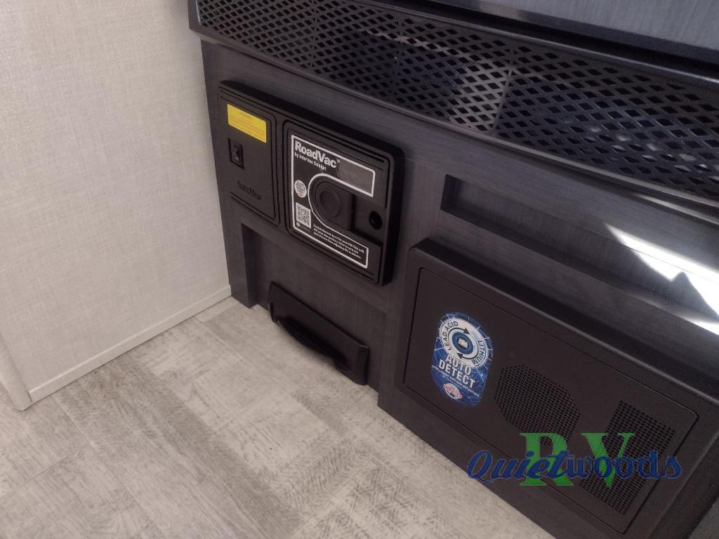 This R Pod travel trailer has quite a few features that will attract your attention! First of all, there booth dinette in front of the LED TV so that you can view your movies in comfort. The walk-through bath gives you an entrance door on both sides, and it also allows you to directly enter the bathroom from the front bedroom. Underneath the RV queen bed in the bedroom, there is under-bed storage so you can keep some sweaters and boots hidden away without taking up any walking space in the bedroom.